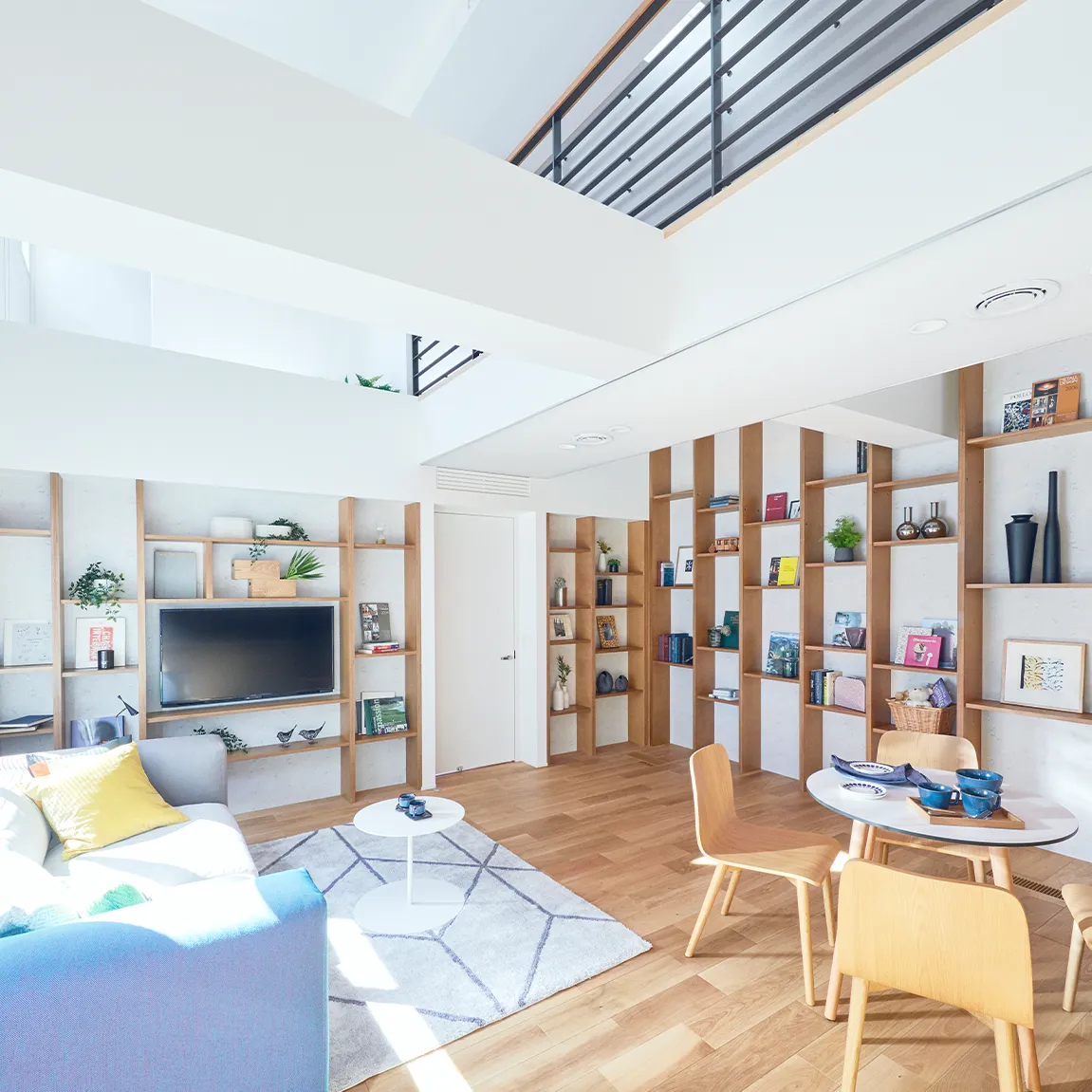 光を行き届かせる吹き抜けとトップライトで一日中やわらかな光が降り注ぐ。