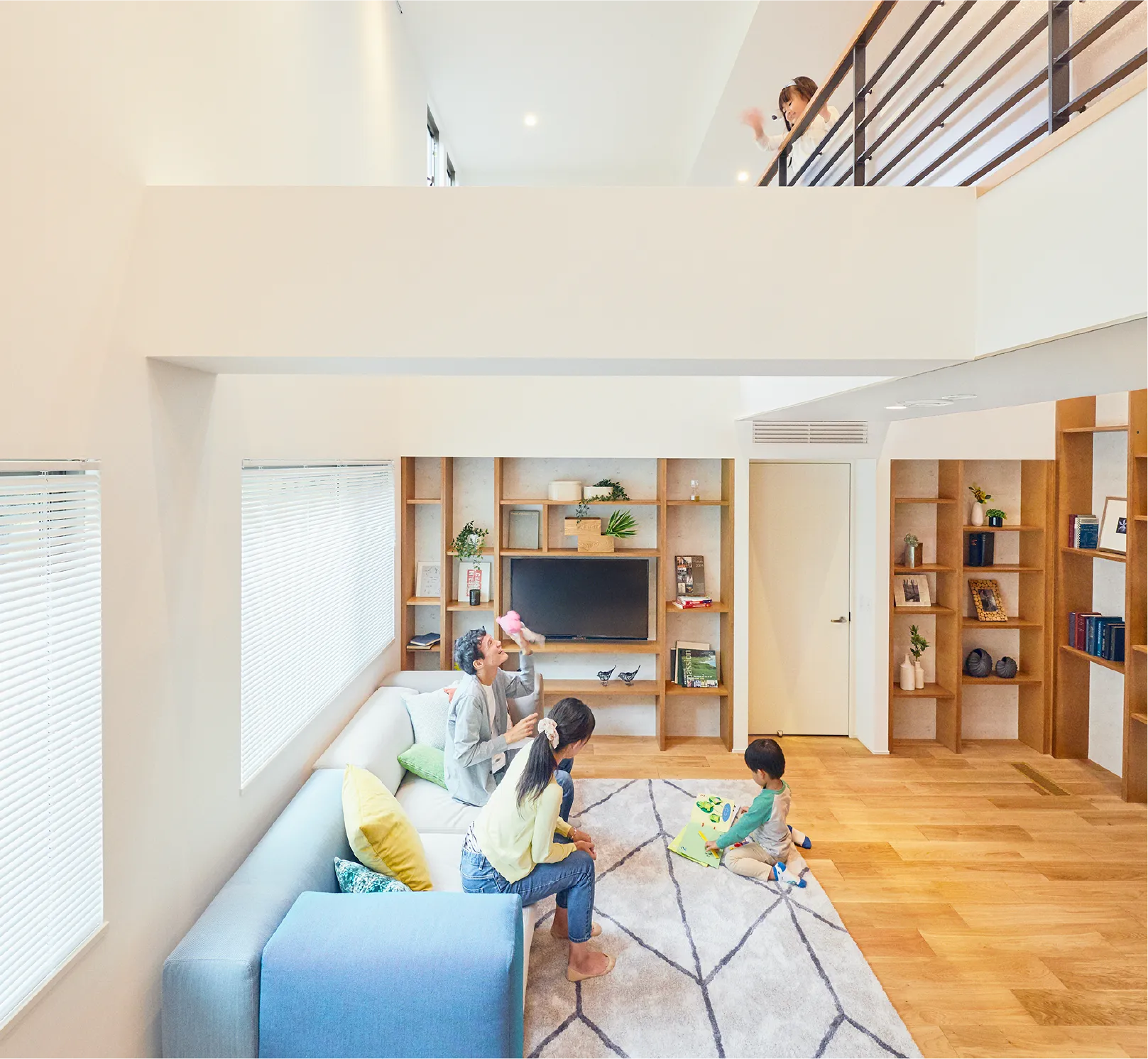 隣地の存在を遮断する外壁と開けた吹き抜け空間で、