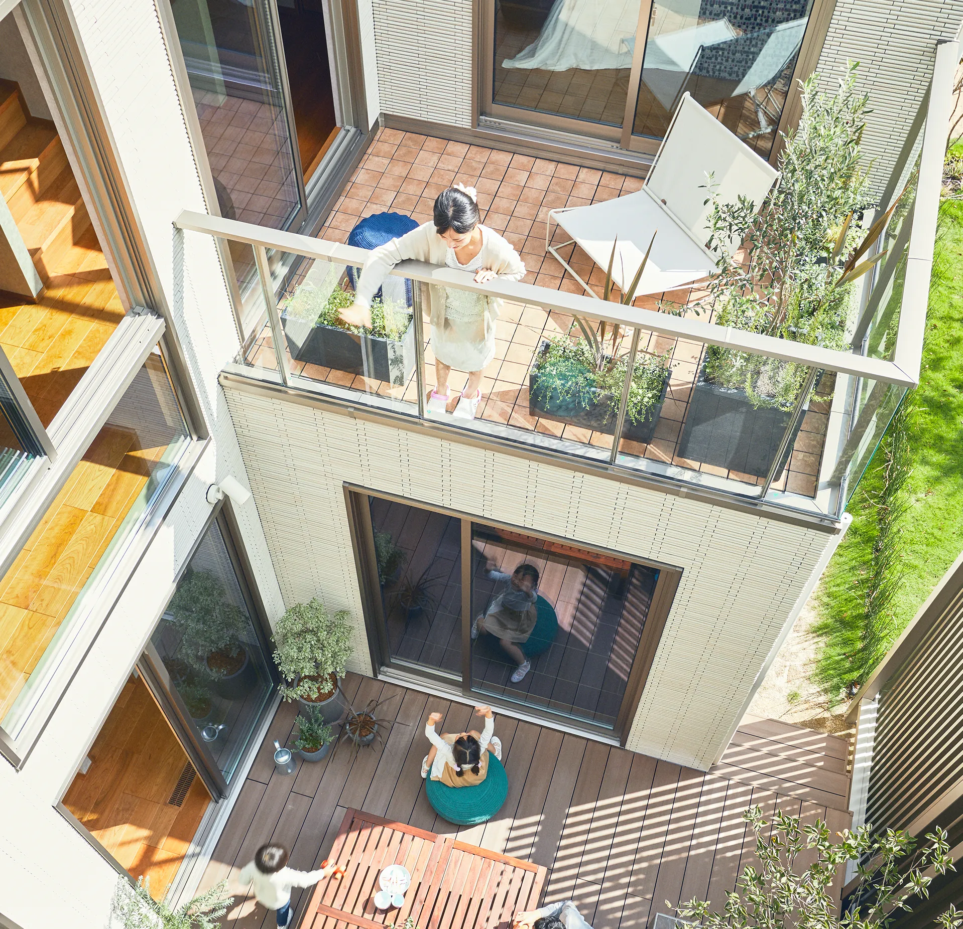 建物の外側を囲いプライバシーを確保しながら、ガレージとバルコニー、