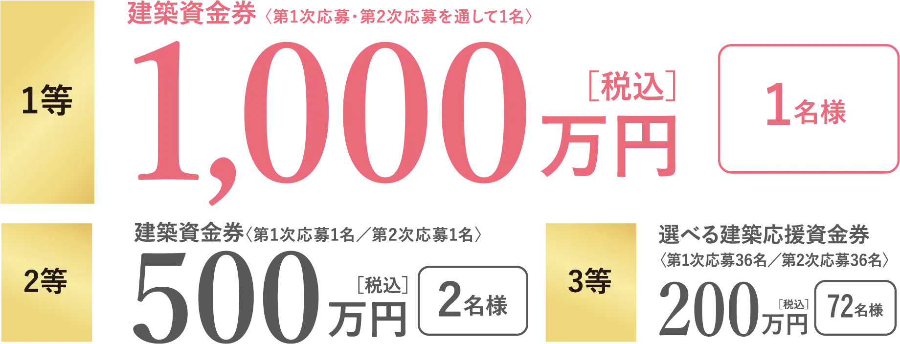 (1次応募:1名、2次応募:1名)、3等200万円分【税込】×72名様(1次応募:36名、2次応募36名)