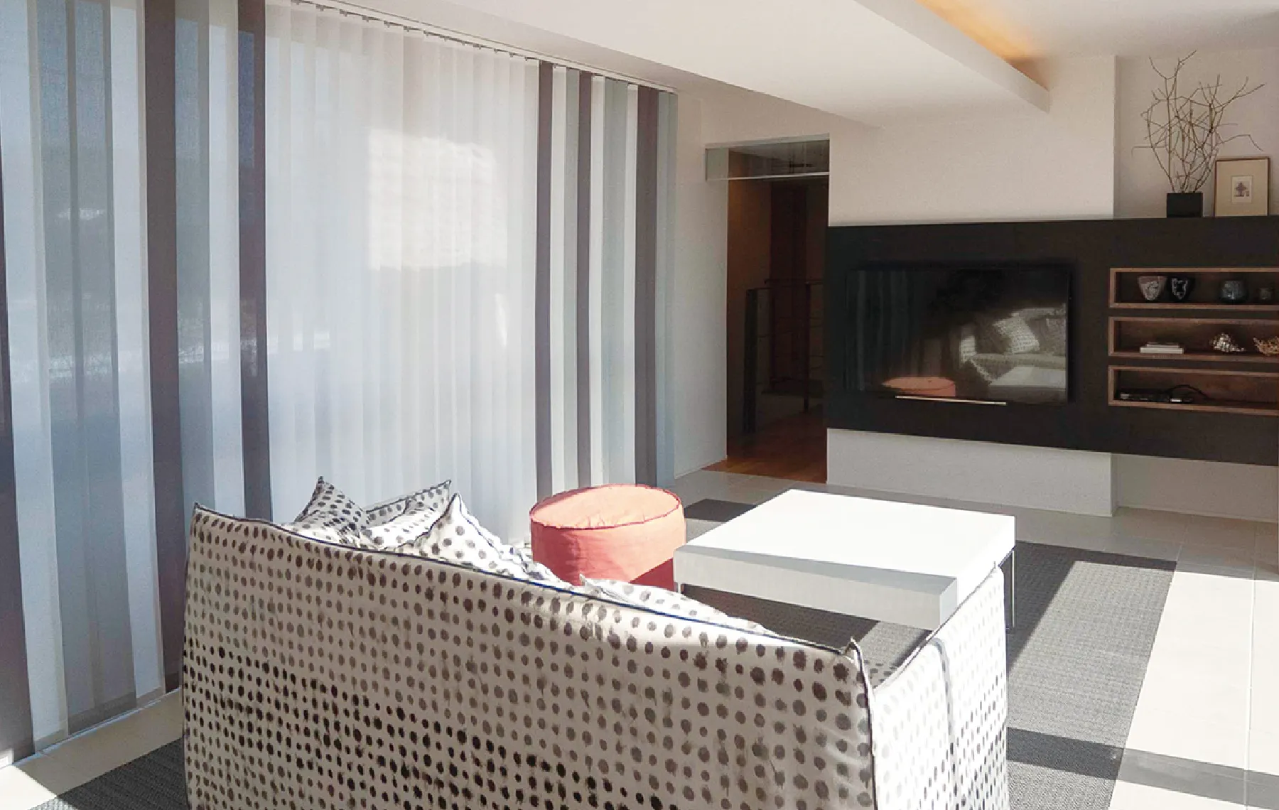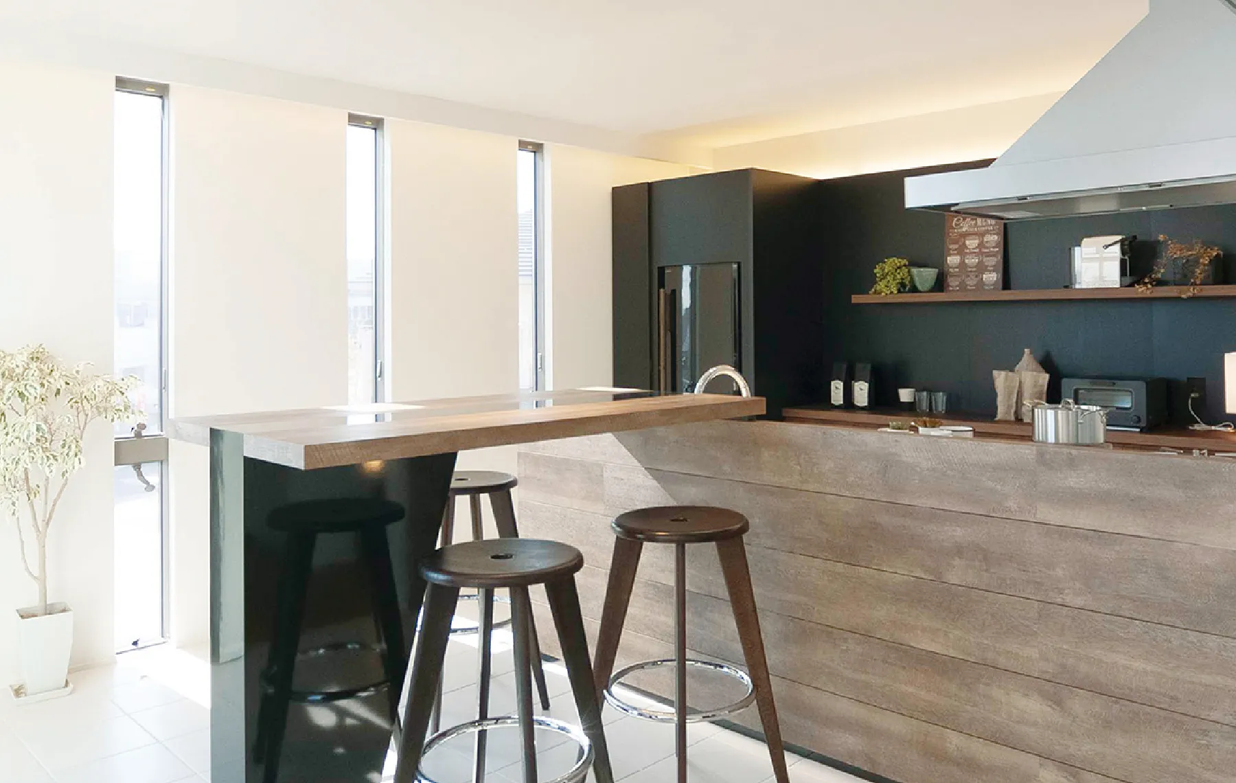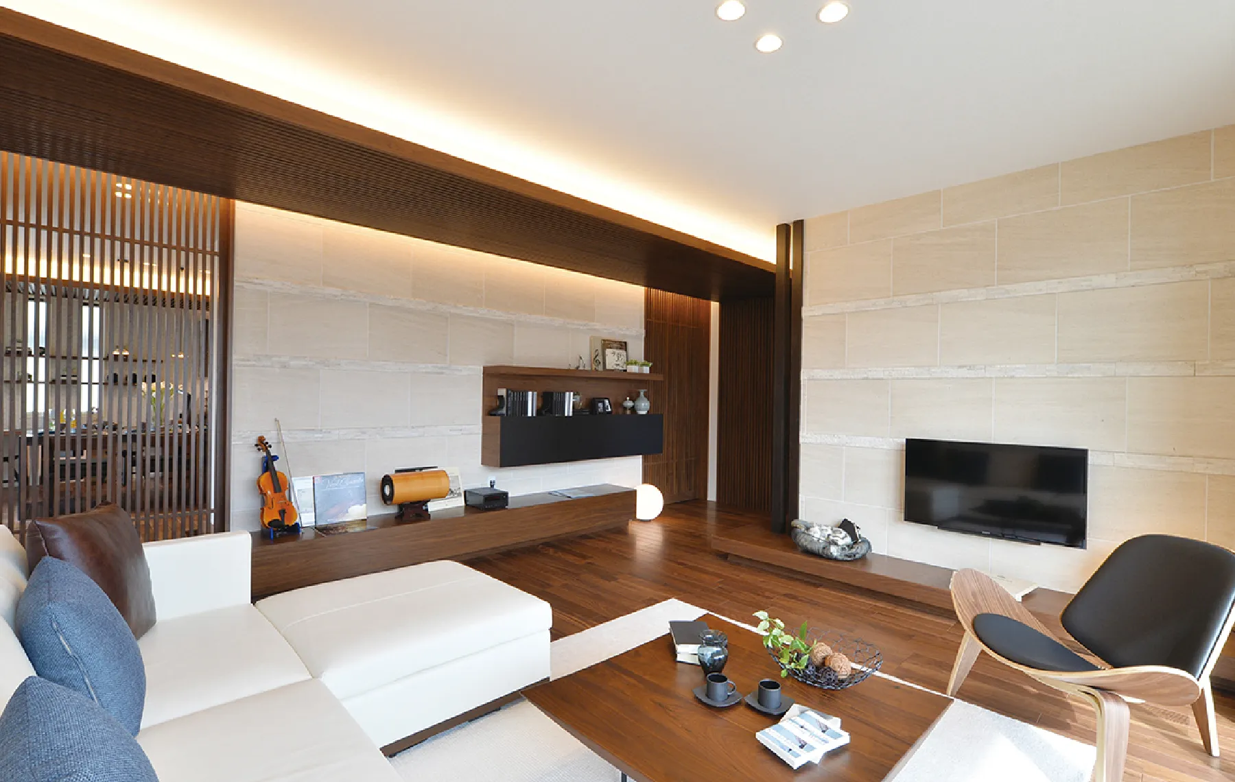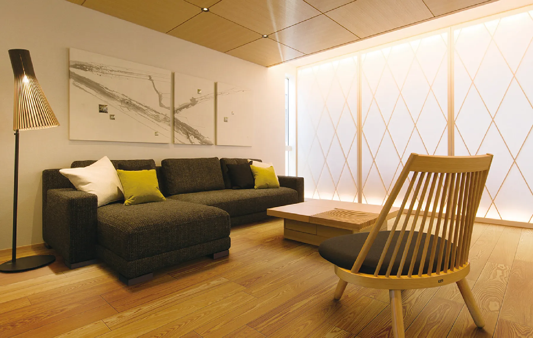 色のコントラストがモダンな空間に、和素材が調和した趣のあるインテリアスタイル。