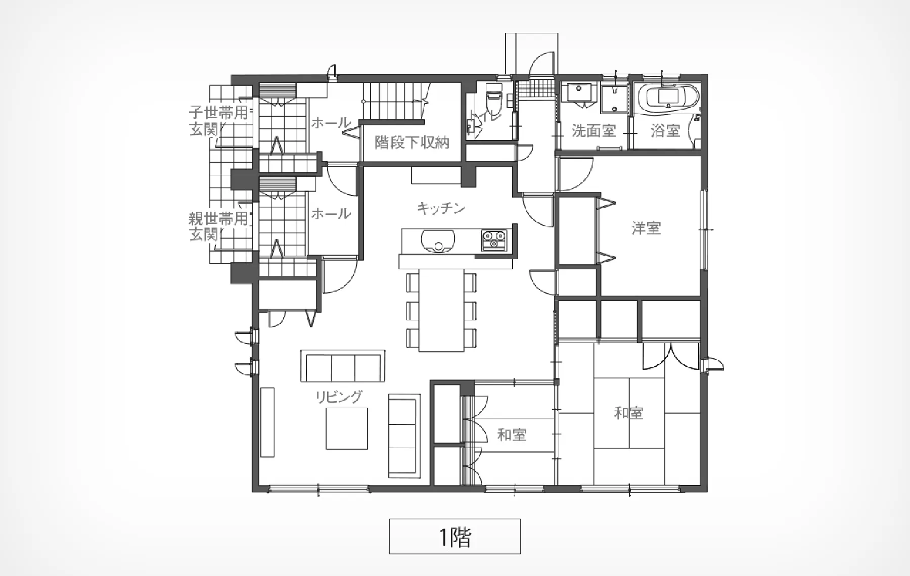 玄関、キッチン、お風呂などをそれぞれに設け、ひとつ屋根の下で生活する空間を区切ります。それぞれの生活リズムでプライバシーを守りながら暮らせます。