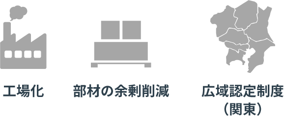 積極的な工場化の推進、部材の余剰削減及び、関東エリアに於ける広域認定制度の運用により、建設副産物量の削減(リデュース)や、建設副産物の再資源化(リサイクル)に取り組んでいます。