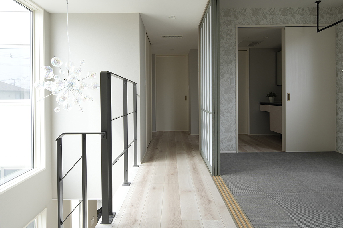 落ち着いて過ごせる空間として、あえて2階に設けられた和室です。引き戸によって隣接する洋室とゆるやかにつながる設計で、閉塞感を抑えつつ用途に応じた使い分けがしやすい仕様に仕上げています。プライベート感があり、来客時の宿泊に最適な配置といえるでしょう。