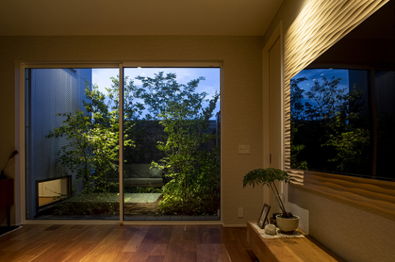 日中はソファから緑を眺める、夜はライトアップされた中庭を楽しむなど、時間帯によって変わる空間の表情が、日々の暮らしに豊かさをもたらしています。