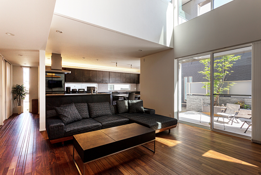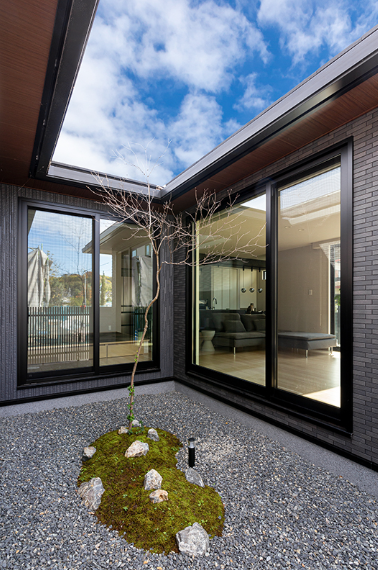 中庭に向かい合うように配置された大開口からは、やわらかな光が室内奥まで行き渡るほか、風の通り道も確保されています。外からの視線を気にすることなく、明るく開放的なリビング空間で心地良く過ごせる住まいが完成しています。