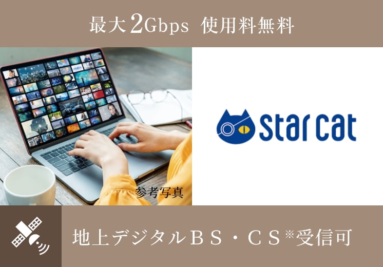 - 各住戸内までに敷設した無料・2ギガ(最大)の高速インターネットを全戸に導入。 ※有料放送には別途料金が発生します。
