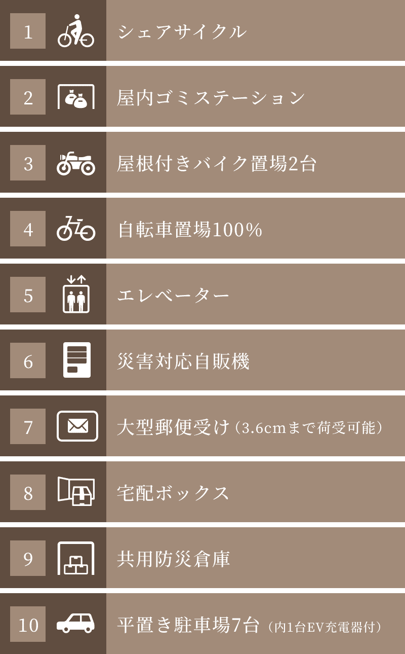 - 市内275ヶ所・30分/165円(税込)で利用できるシェアサイクルポートが敷地内にあります。 ※利用料金は2023年4月現在の情報です。利用料金の詳細及び利用時間等につきましては「カリテコバイク」公式サイトにてご確認ください。今後、運営会社の意向で価格が変更となる場合があります。予めご了承ください。