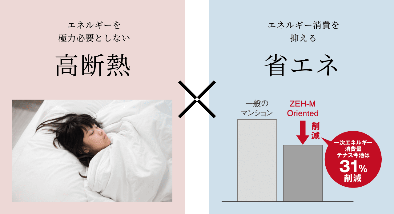 「ZEH-M Oriented」を採用 - 強化外皮基準(断熱性能)を満たし、省エネによる一次エネルギー消費量を、省エネ基準値から20%以上削減する基準において、「テナス今池」は、エネルギー消費量を31%削減しています。