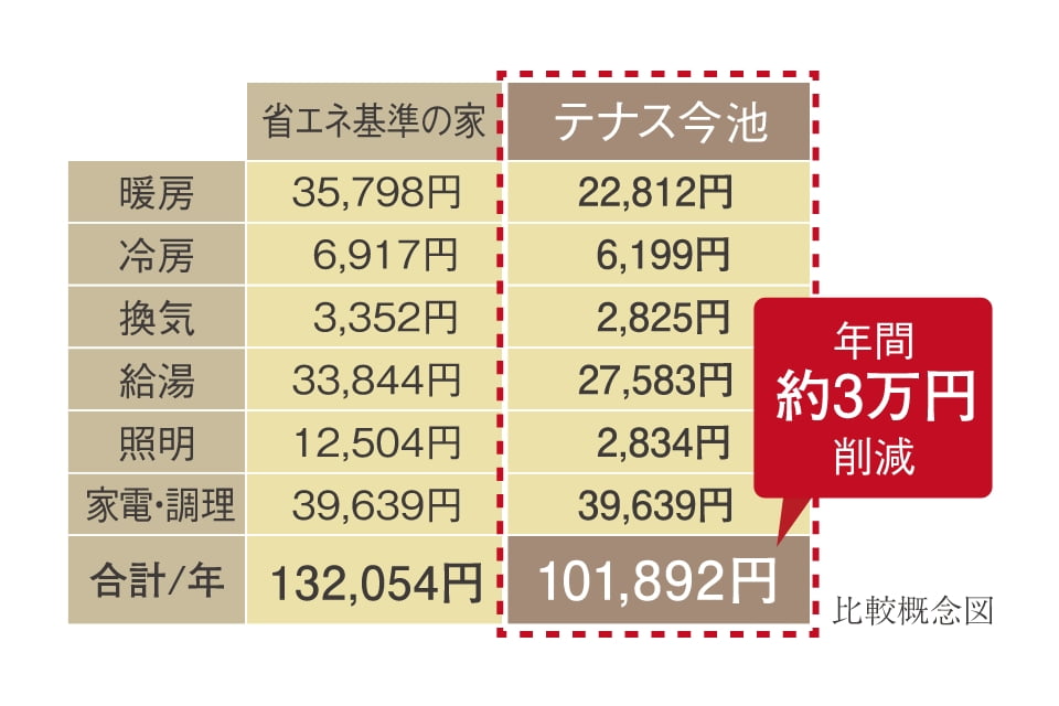※上記比較図の年間光熱費は「住まいの燃費通信簿」に記載の国が定める省エネ基準の家とテナス今池(104号室)と比較したものとなります。年間光熱費は国が定める基準に基づき算出したものです。概念図の年間光熱費は実際の年間光熱費を保証するものではありません。