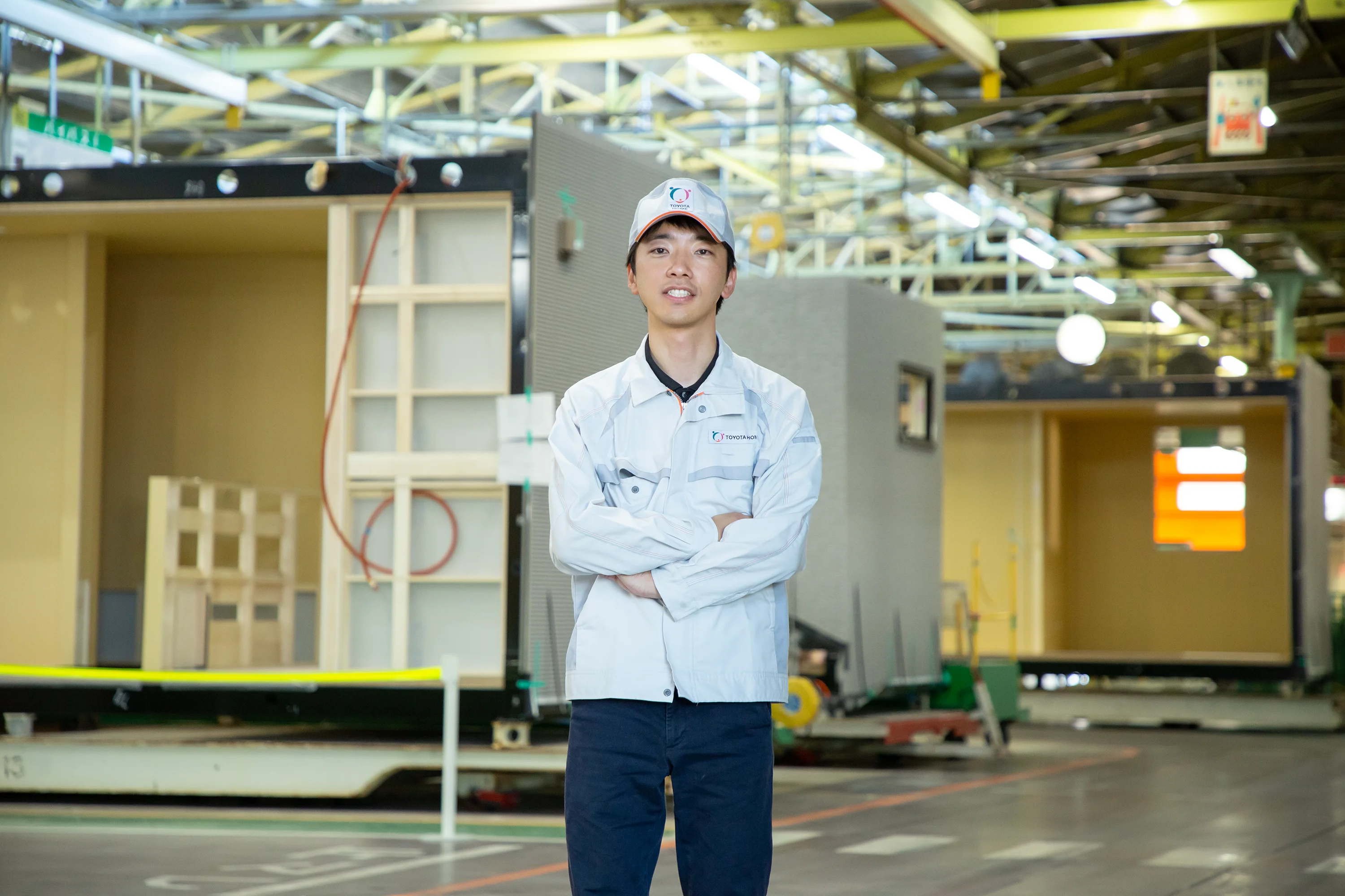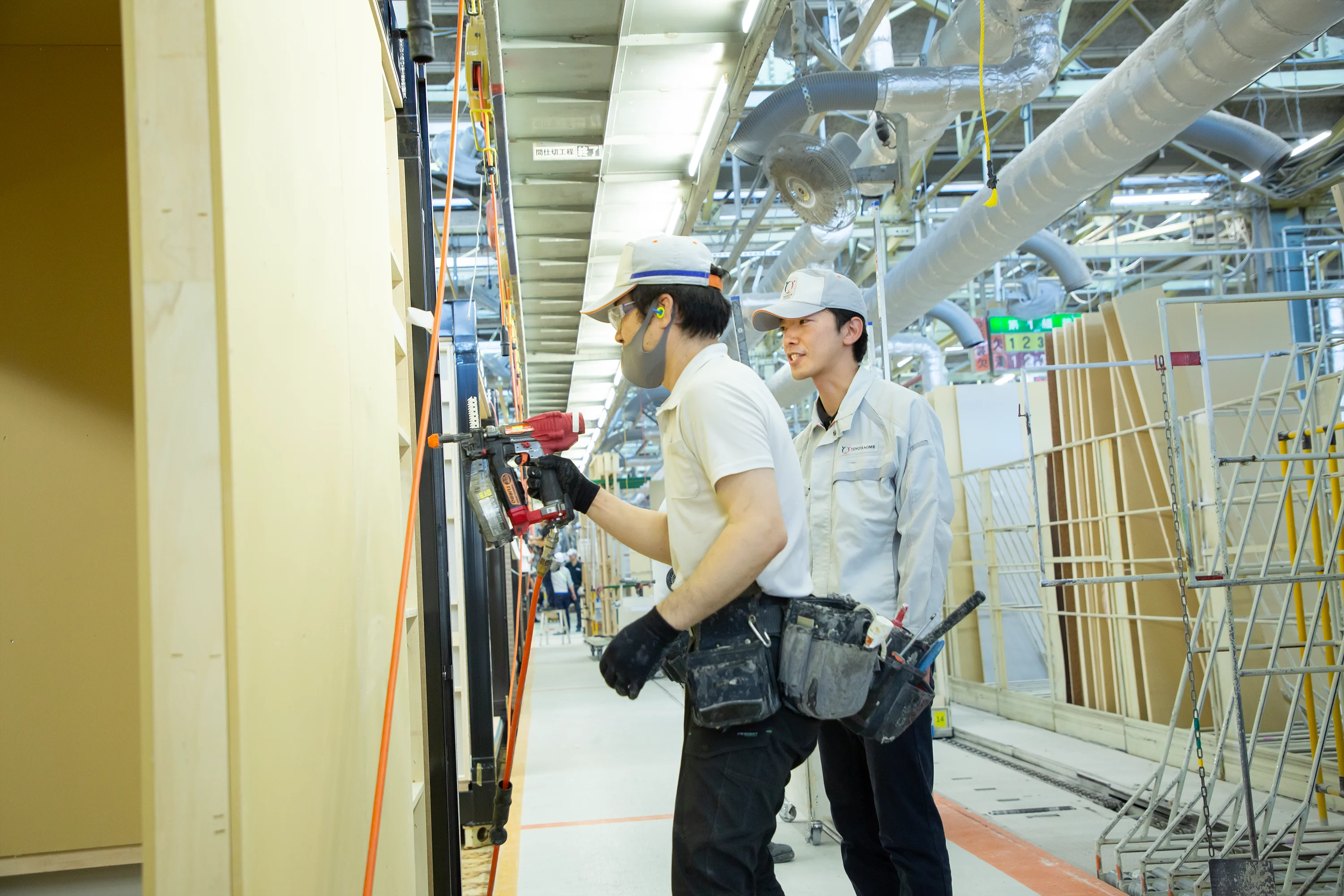 - トヨタホームの住まいは、全体の約85%を工場で生産します。その理由は、天候や職人の質に左右されない環境で一棟一棟の家づくりを丁寧に行い、高品質で快適に暮らせる住宅をお客様に提供するため。生産技術の主な役割は、そんなトヨタホームの心臓部ともいえる工場の生産ラインの設計。新商品が企画されたときには、商品開発の部門と連携して生産の効率やコストを考慮しながら実際に工場でどのようにつくっていくか生産方法の検討も行っています。