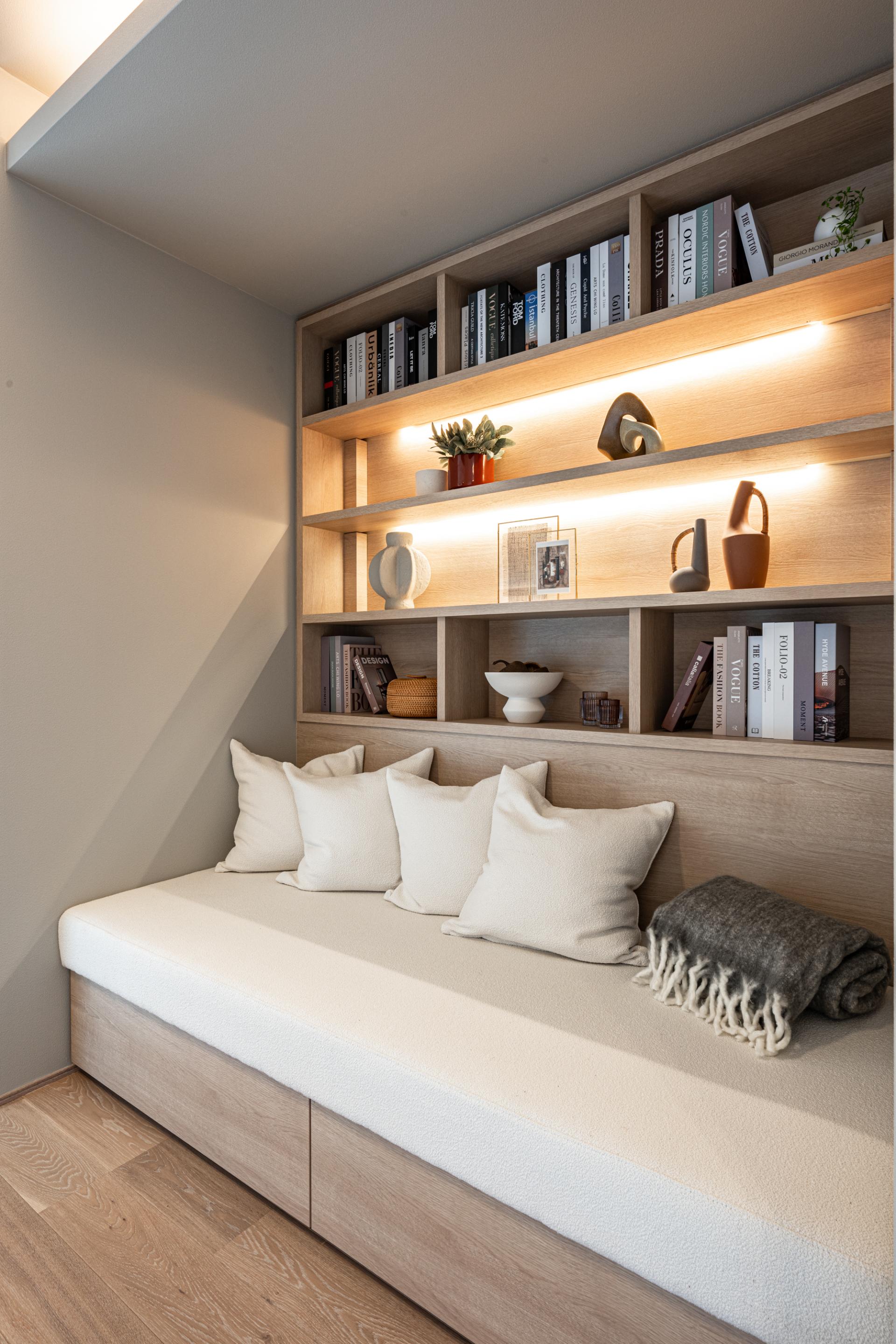 リビングの音が伝わりにくよう吹抜けと距離を設けた主寝室