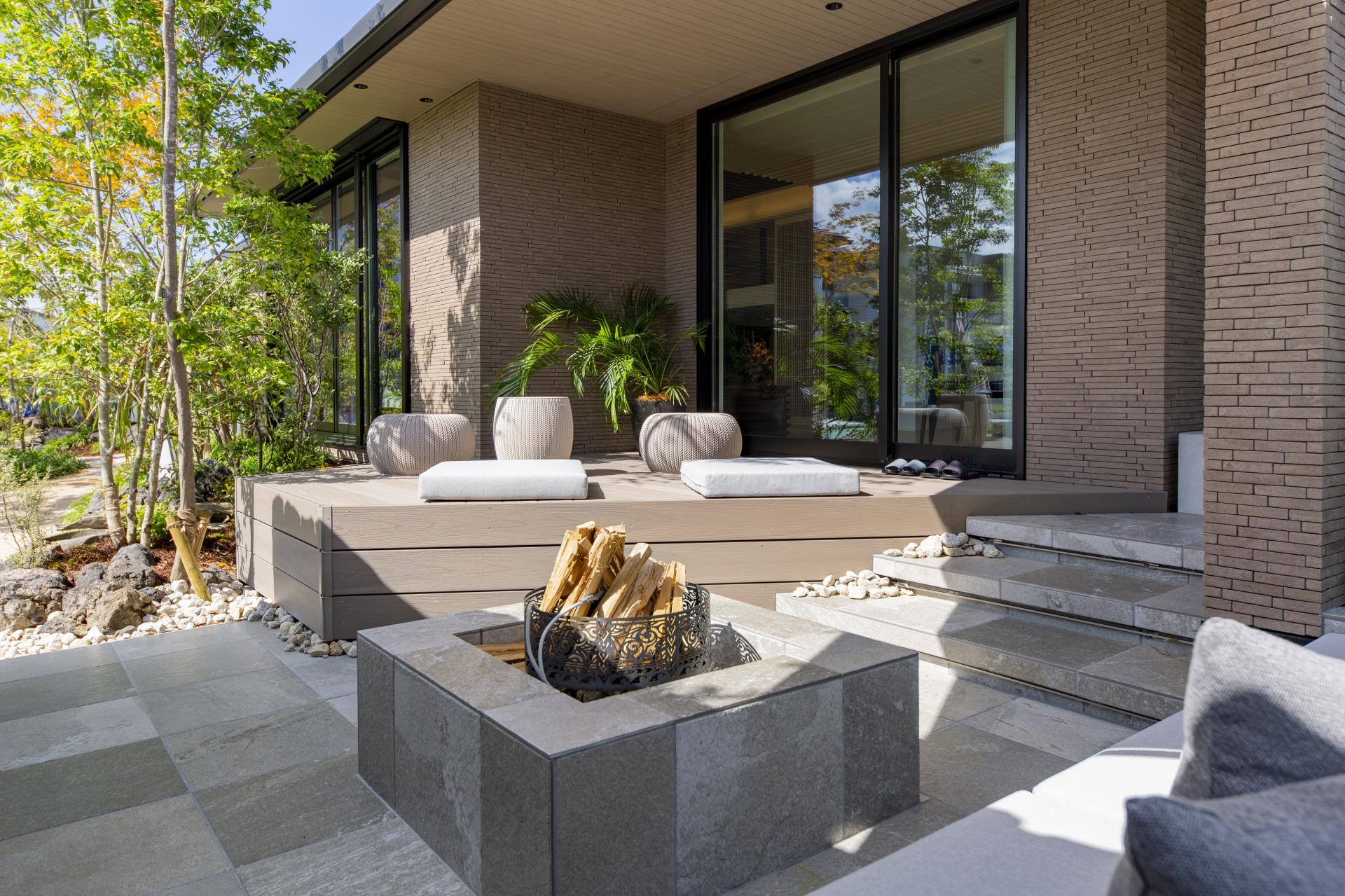 バーベキューやミニプールも楽しめる人工芝の中庭