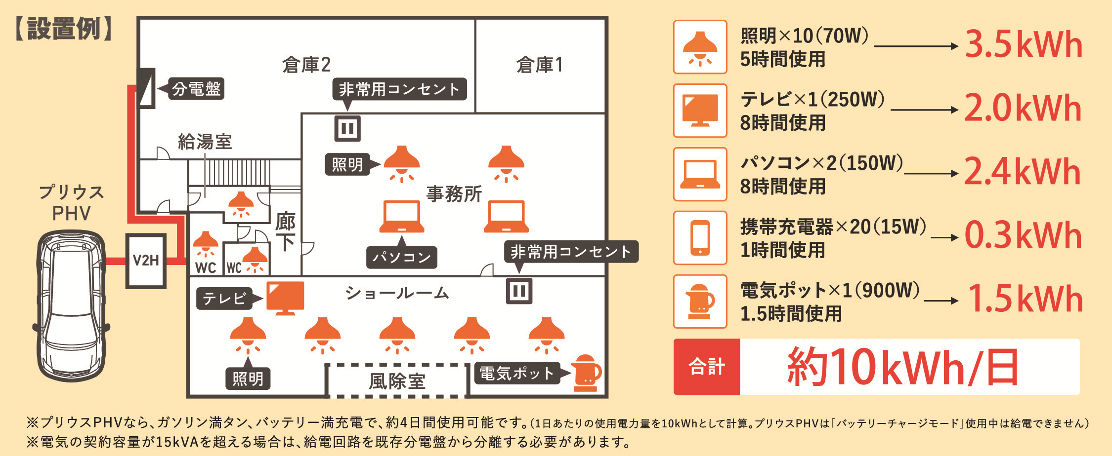 また、東海地震などの災害時のブラックアウト対策時の停電対応としてV2Hスタンドを使用して約6kw/1台の電気を送ることにより、停電時でも照明、パソコンなどの使用が可能になります。