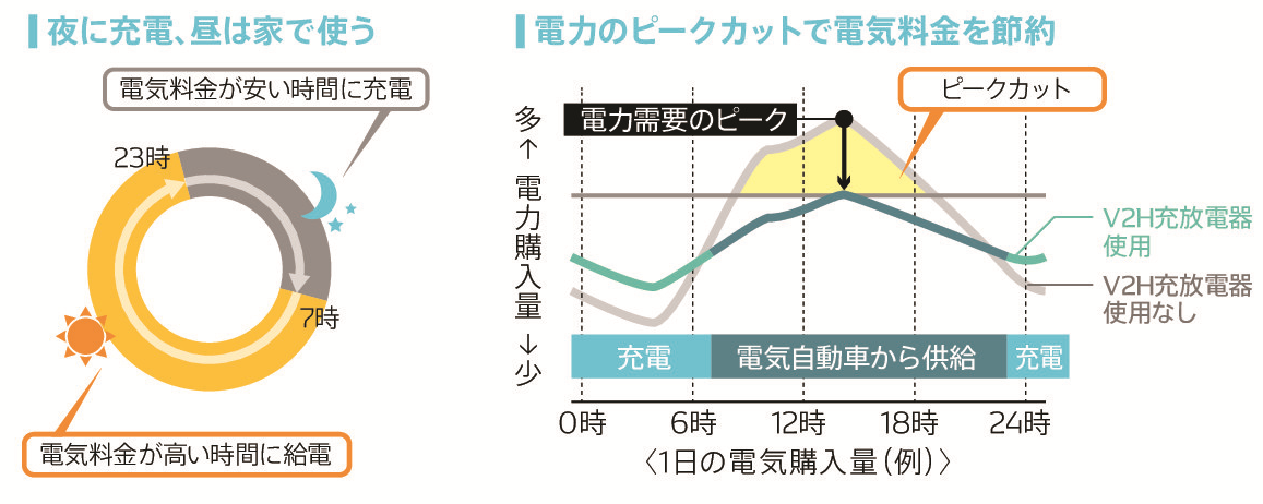 電力消費ピーク時(日中)は太陽光発電等で作られた電気を効率よく使用して不足分があれば車から放電し割高な電気は可能な限り使いませんので、夜は割安な深夜電力を車に蓄電して日中の使用に備えます。車の使用はその蓄電された電気を使う事でガソリンの使用を減らすことができます。