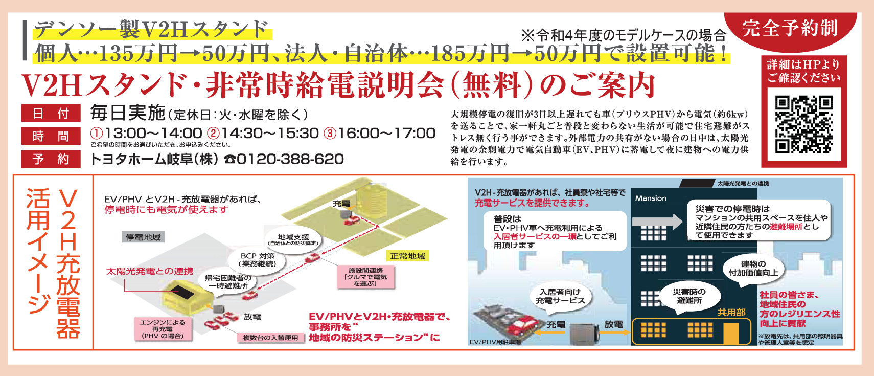 『販売店キャンペーンページ』よりV2Hスタンドの詳しい説明と非常時給電説明会のご案内がございます。