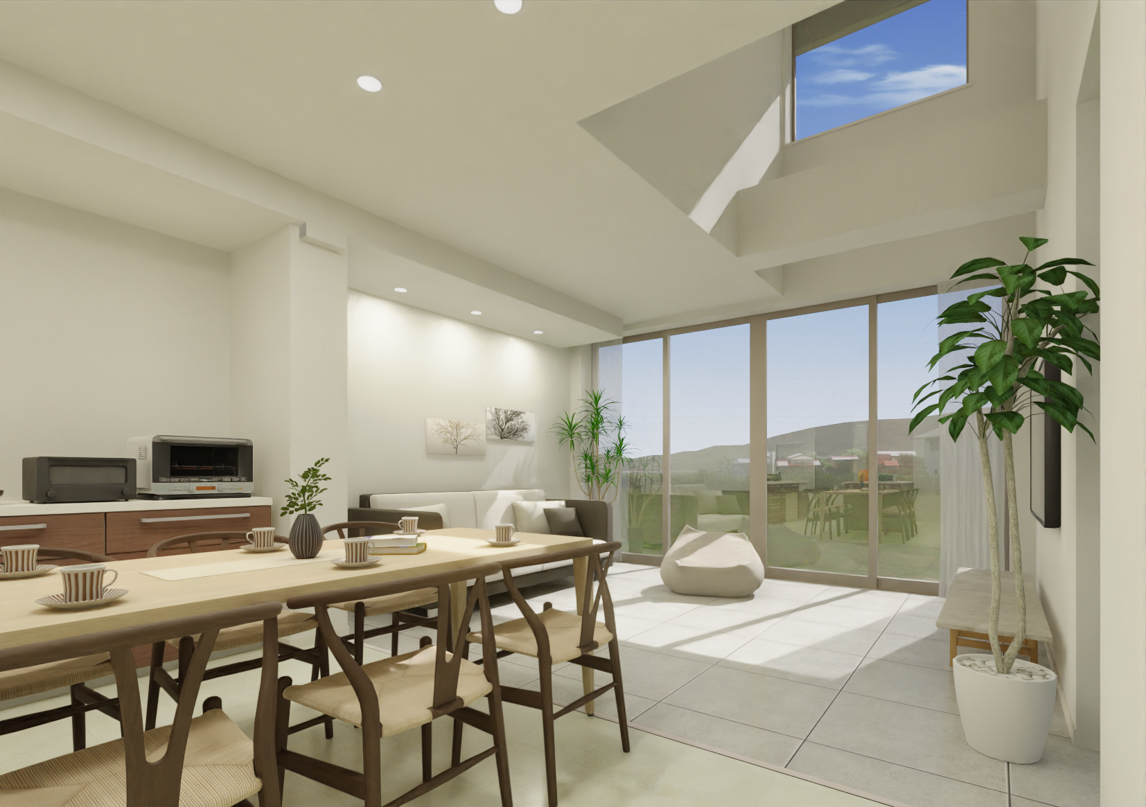 ・ワイドサッシ&ハイサッシと吹抜けのある開放的なリビング
