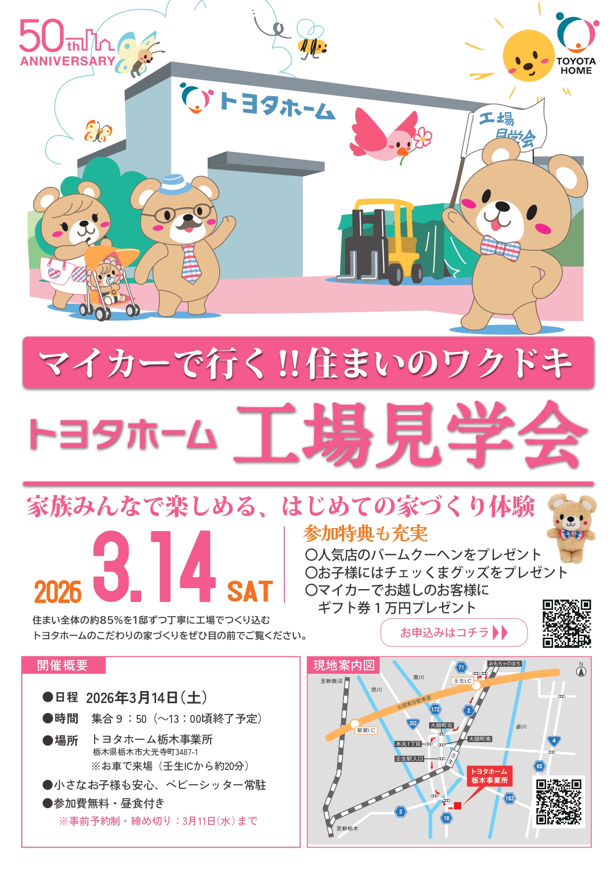 【3月14日開催!!】マイカーで楽々!トヨタホーム工場見学会|参加特典ギフトカード1万円プレゼント! 工場見学会