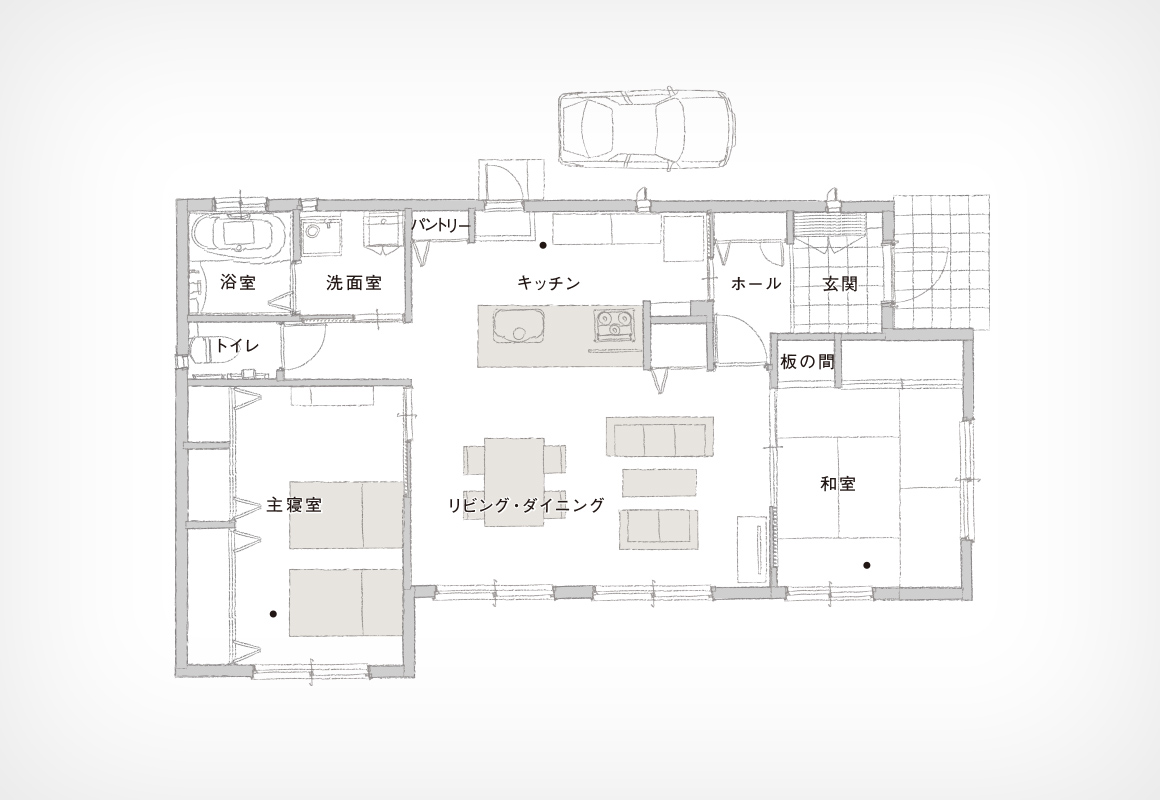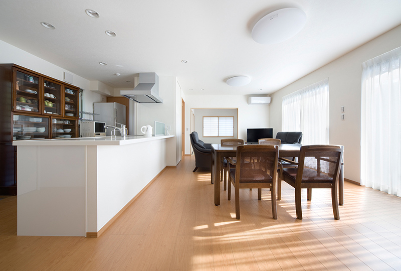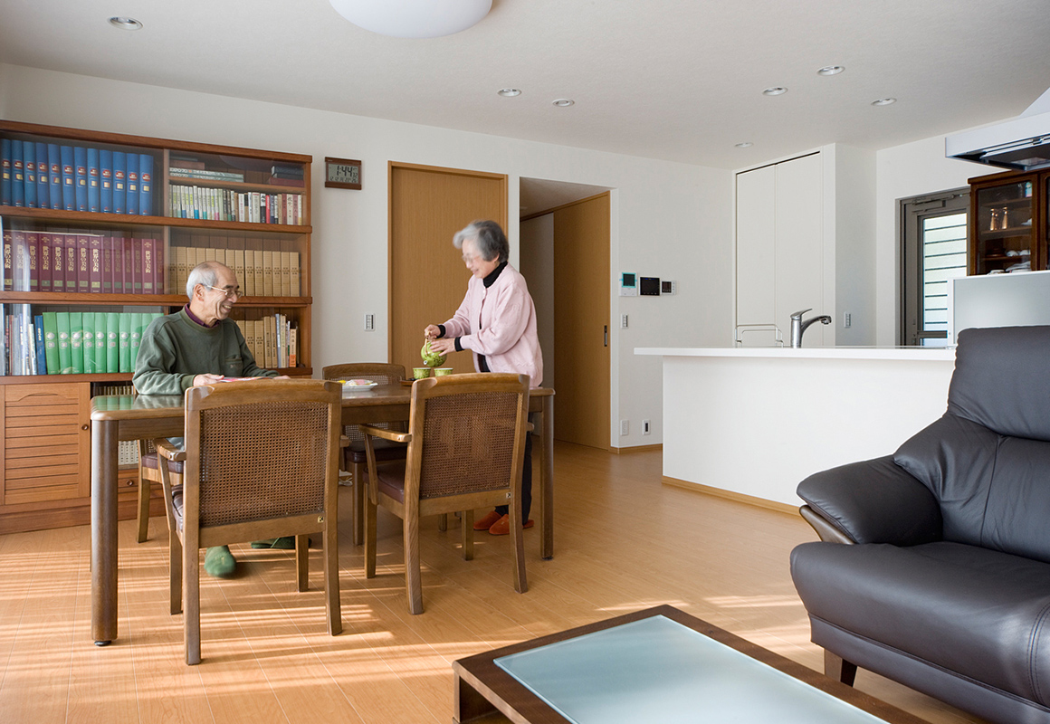 ゆったりとした佇まいが印象的な、O様の平屋建て住宅。ご夫婦二人の今後の暮らしを考えて、長年生活した2階建て住宅からの建て替えを決めました。間取りを検討する際、特に重視したのは、コンパクトな動線設計です。生活の中心であるリビングを囲むように寝室や和室、水まわりスペースを配置し、少ない移動距離で行き来できるよう配慮しました。また、ご夫婦間のコミュニケーションが取りやすいことも、すべての空間がワンフロアでつながる平屋ならではのうれしさです。必要な時にすぐに言葉を交わせる快適さと安心感を、ご夫婦ともに実感されています。