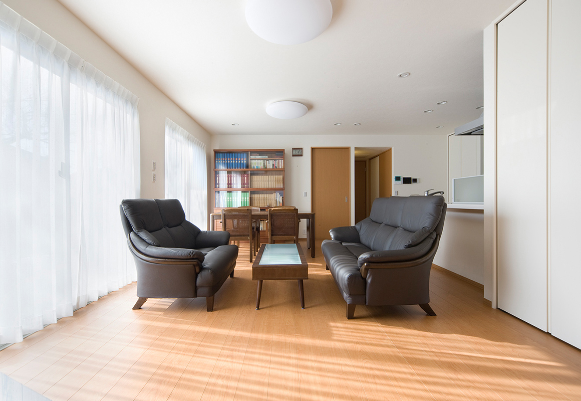 O様ご夫妻が一日の中でもっとも長い時間を過ごす、リビング。「二人で話をしながら、本を読んだりテレビを見たり、のんびりと過ごすことが多いですね」とご主人。快適さに満足されているご様子です。窓の外に広がる庭の景色も、リビングで味わえる楽しみのひとつ。桜が美しく咲く季節を、毎年心待ちにされています。