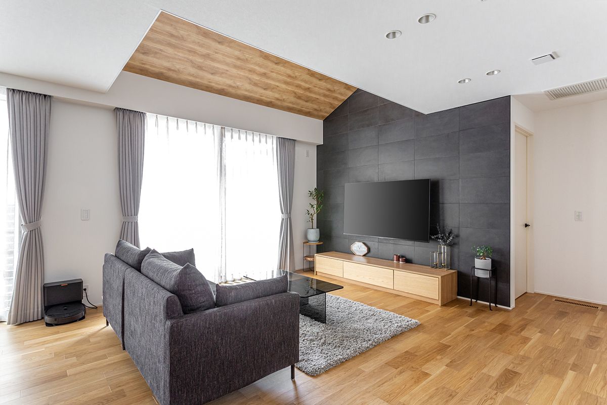 リビングは吹抜けがあることで、平屋とは思えないほどの高さがあり、広々と開放的に寛げます。木目柄の勾配天井はデザイン面でも目を惹くポイント。木の温かみを感じる空間に、ダークグレーのタイル壁が引き締まった印象を加えており、絶妙な素材バランスです。入居当初、リビングの一角にあるスマート和室には、冬にこたつを置こうと計画されていたK様。「全館空調『スマート・エアーズ』のおかげで室内が十分に暖かく、こたつの出番がありませんでした。猫の居場所にぴったりだったので、ケージやおもちゃ等を置いて、猫たちが寛げるスペースを作っています」と、ご夫婦と猫たちが共に快適に過ごせるリビングが完成しました。