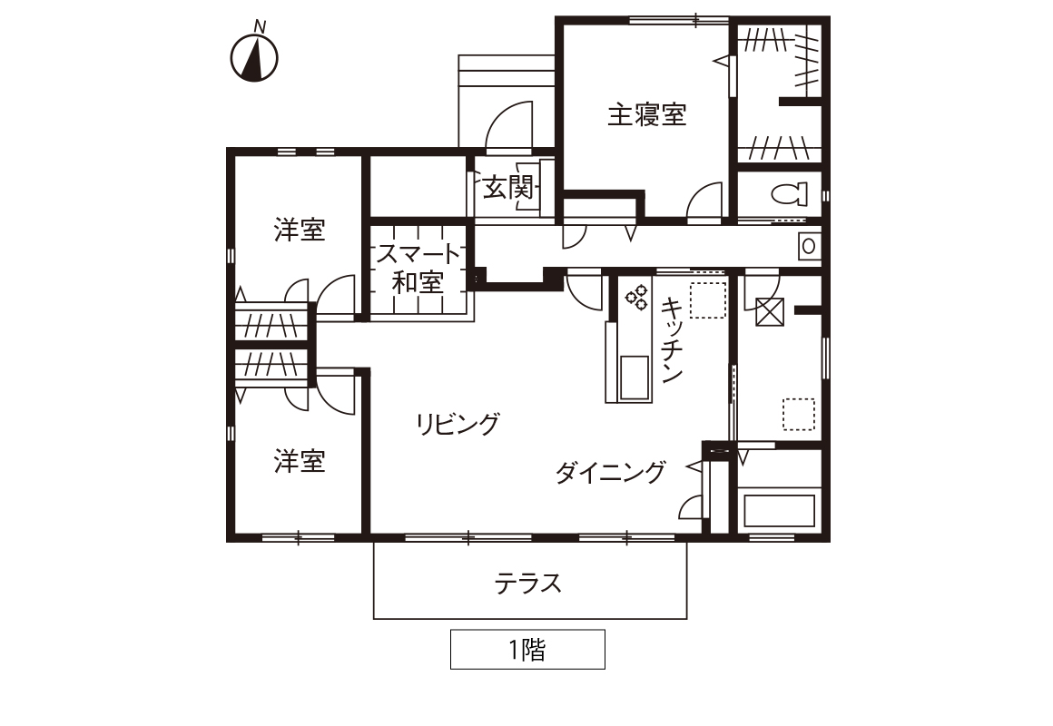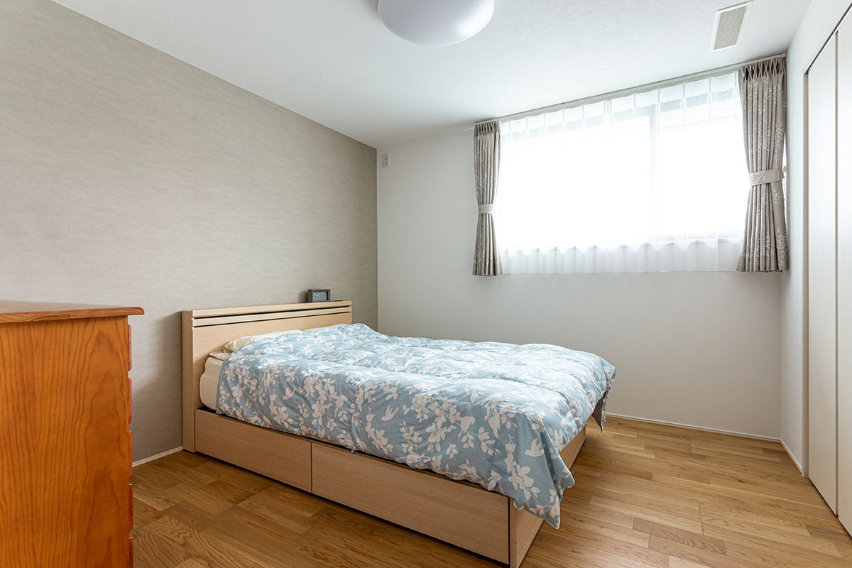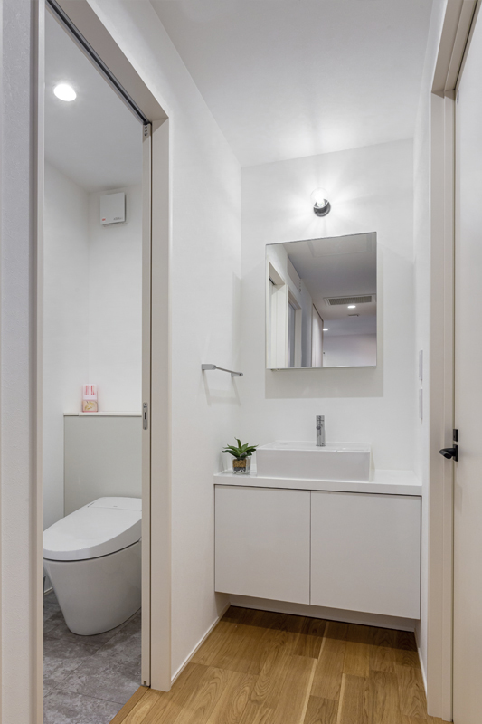 キッチンの裏に配置した脱衣兼ランドリースペースは、洗面スペースを別に設けたこともあり余裕のあるサイズ感。造り付けのカウンターは、落ち着いて座ってスキンケアやメイクができるので大活躍だそうです。また、全館空調「スマート・エアーズ」のおかげで、いつでも快適な室温なのも嬉しいポイント。朝の準備や入浴後も気持ち良く過ごせます。そこから扉を隔てて洗面台、トイレが続きます。洗面台が脱衣やランドリースペースと分離していることで、ゲストが手洗いする際、洗濯物など家族のプライベートな場所を見せずに済みます。また、水廻りはキッチン、寝室や玄関からもアクセスしやすく、且つ回遊できるので、少ない移動距離で生活ができて抜群の利便性です。