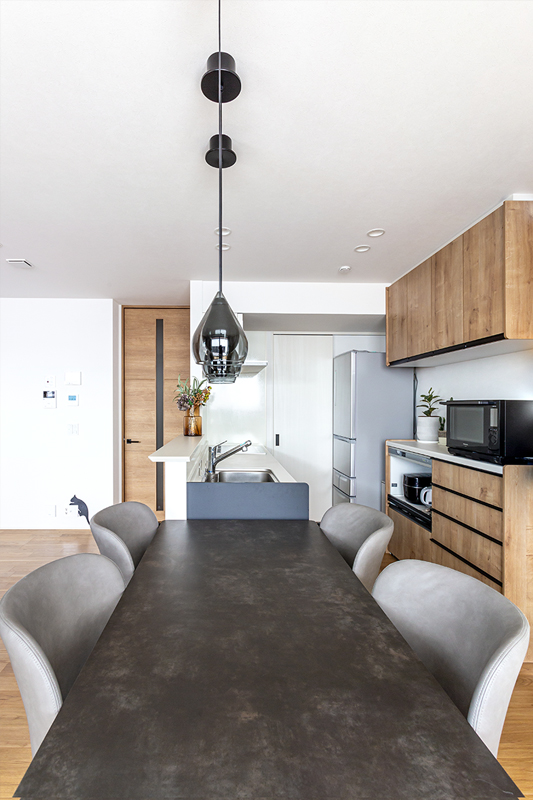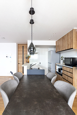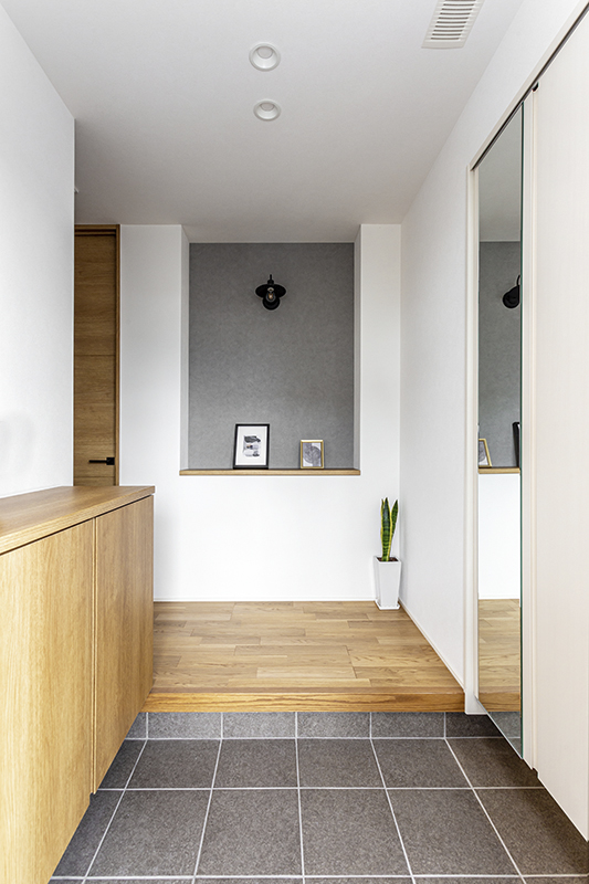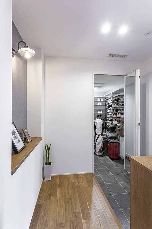 玄関ドアを開けるとまず視界に飛び込むのは、正面に設けたニッチカウンター。外観とも連続性をもつグレーカラーのアクセントクロスに、どこか温かみを感じるシェードのブラケット照明が印象的です。玄関土間には左手にシューズボックス、右手には土間続きのウォークインクローゼットがあり、収納量たっぷり。クローゼットには靴の他にも、スーツケースやゴルフバッグなどを帰宅後そのまま収納することができます。また、収納扉は壁に合わせたホワイトにすることで存在感を排除しつつ、扉1枚全面がミラーになっているので、お出かけ前の身だしなみもしっかりチェックできます。