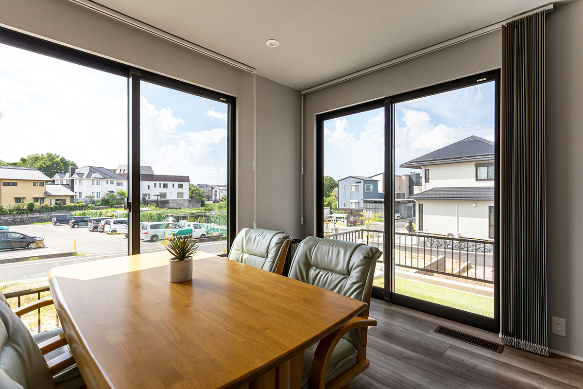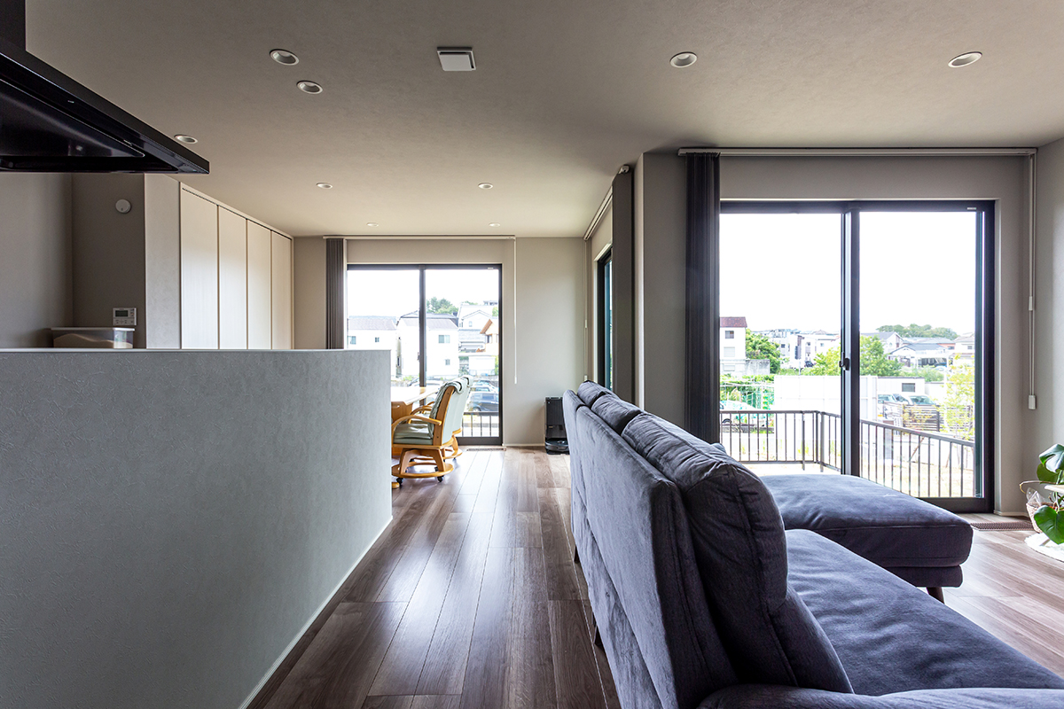LDKは庭を囲むようにL字型のレイアウトにすることで、どこからでも庭の様子が眺められ、出入りがしやすくなっています。3面に連続する掃き出し窓が光をたっぷり取り込み、外観からは想像できないほど開放感であふれています。「友人が集まってバーベキューを楽しむ庭は絶対に欲しかった」とT様。「子供が庭で遊ぶようになったら、料理中など用事をしながらでもしっかり見守れるので庭の場所はここに決めました」と、庭とLDKのつながりにこだわられたそうです。