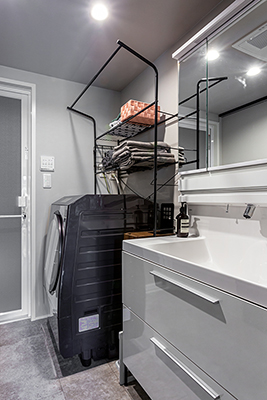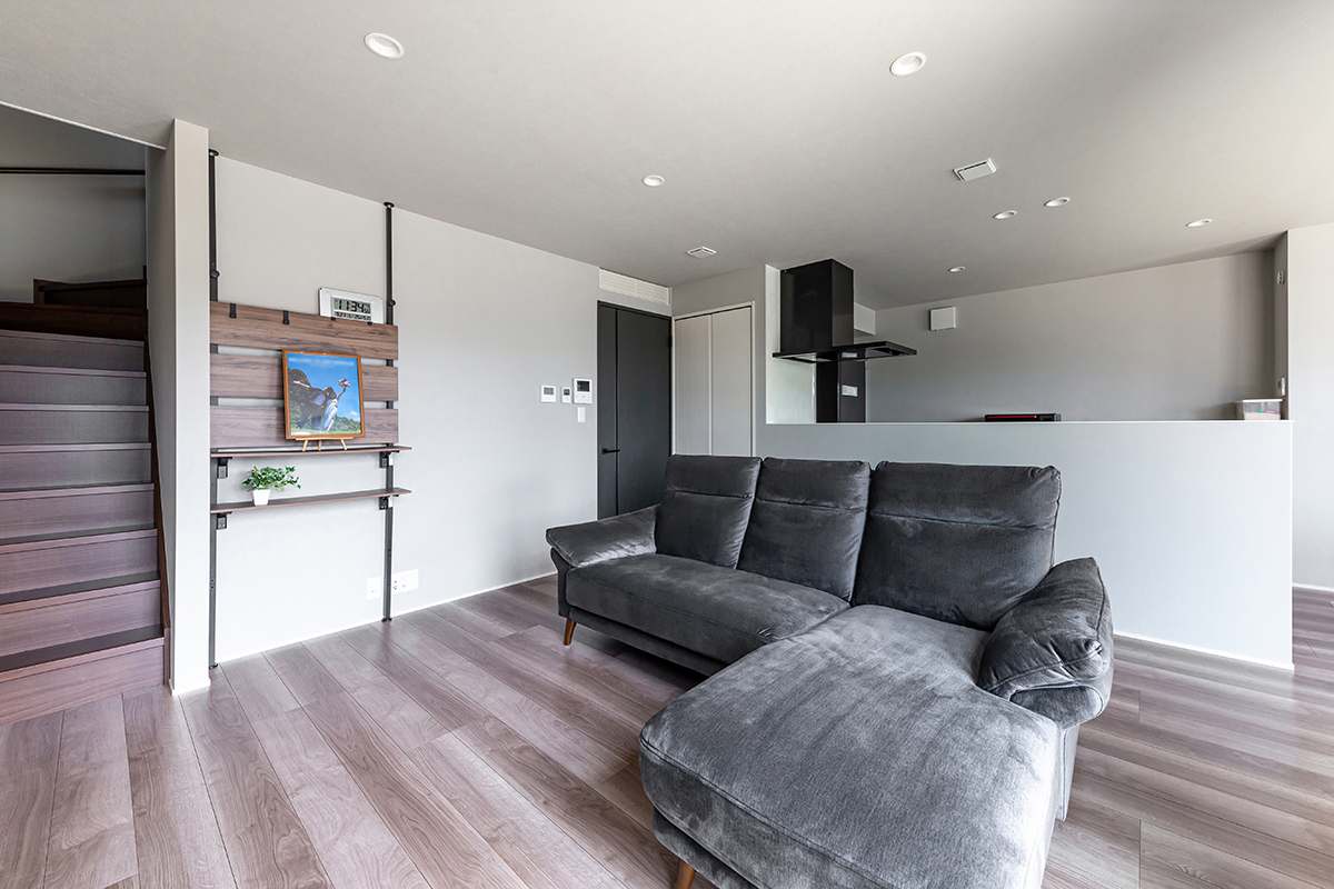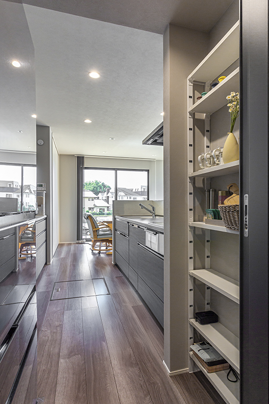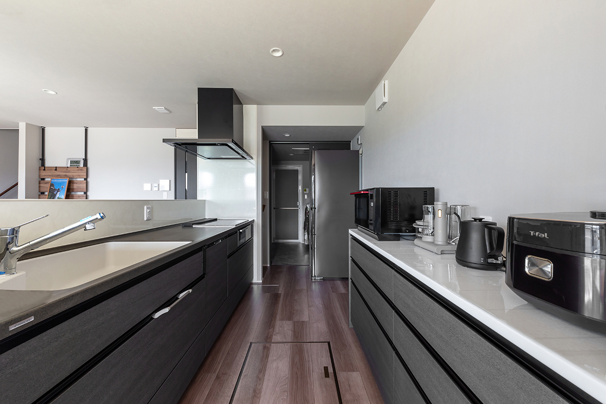 ダークカラーのスマートなデザインが、モダンなインテリアに溶け込むキッチンは、L字型LDKの中心に位置します。これにより、キッチンに立つと右手にダイニング、正面にリビングと全体が見渡せ、家族とテレビを観ながら談笑したり、遊ぶお子様に目を向けたりと、料理中も閉鎖感なく安心して過ごすことができます。また、調理家電を並べても余裕を持つ背面カウンターは充分な収納量があり、日々の家事を頼もしく支えます。「料理をしている時が一番家を建てて良かったと実感します。キッチンからテレビが観られる配置なのがお気に入りです」とT様。