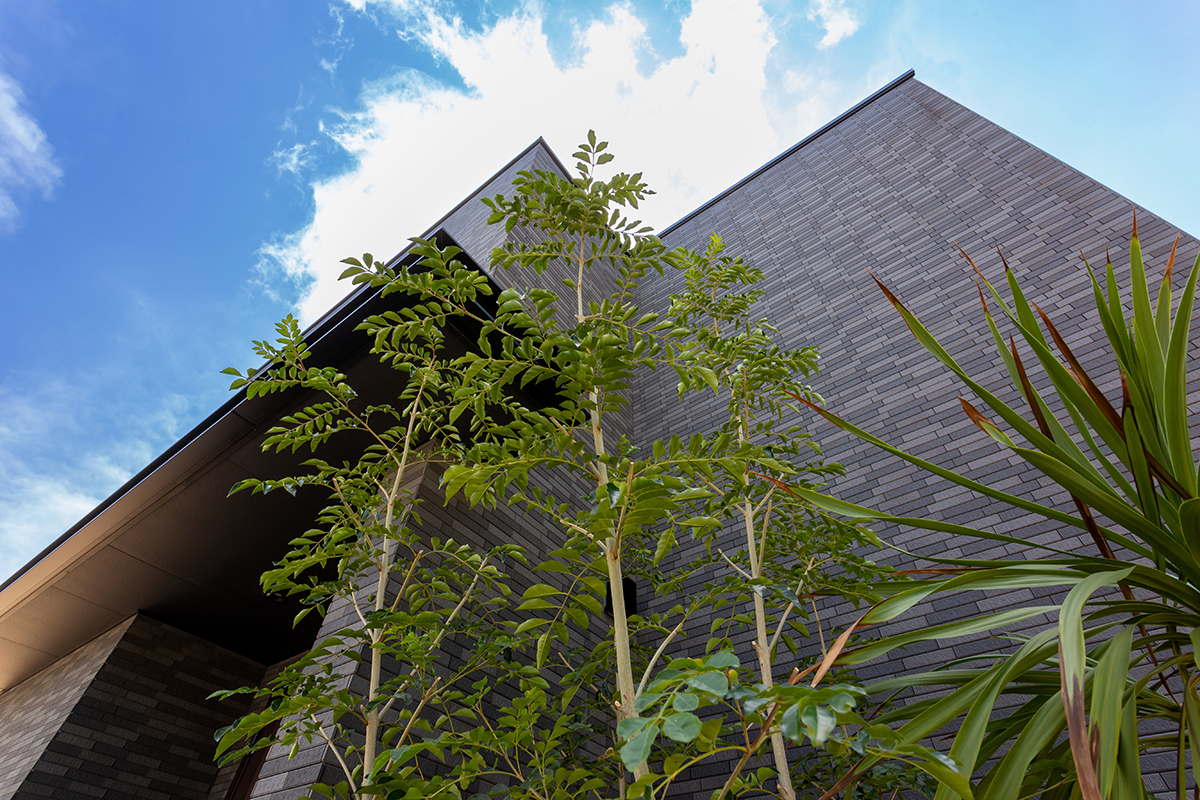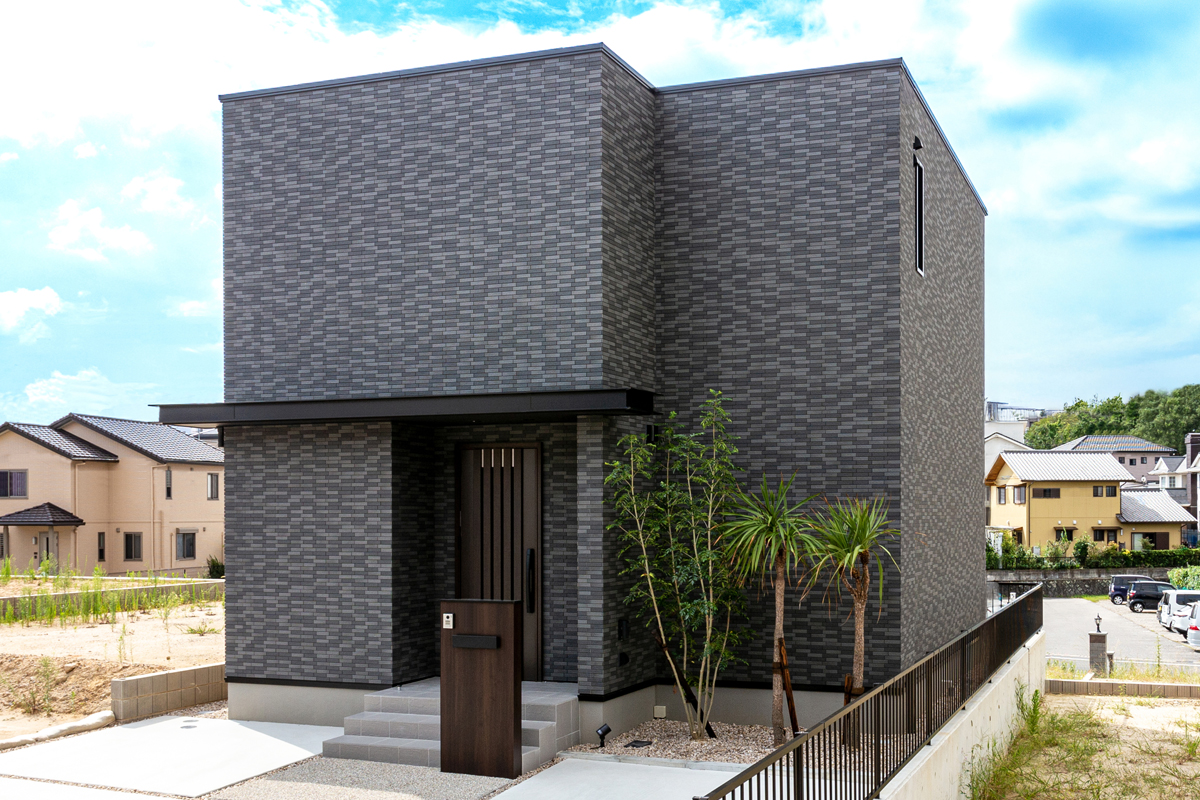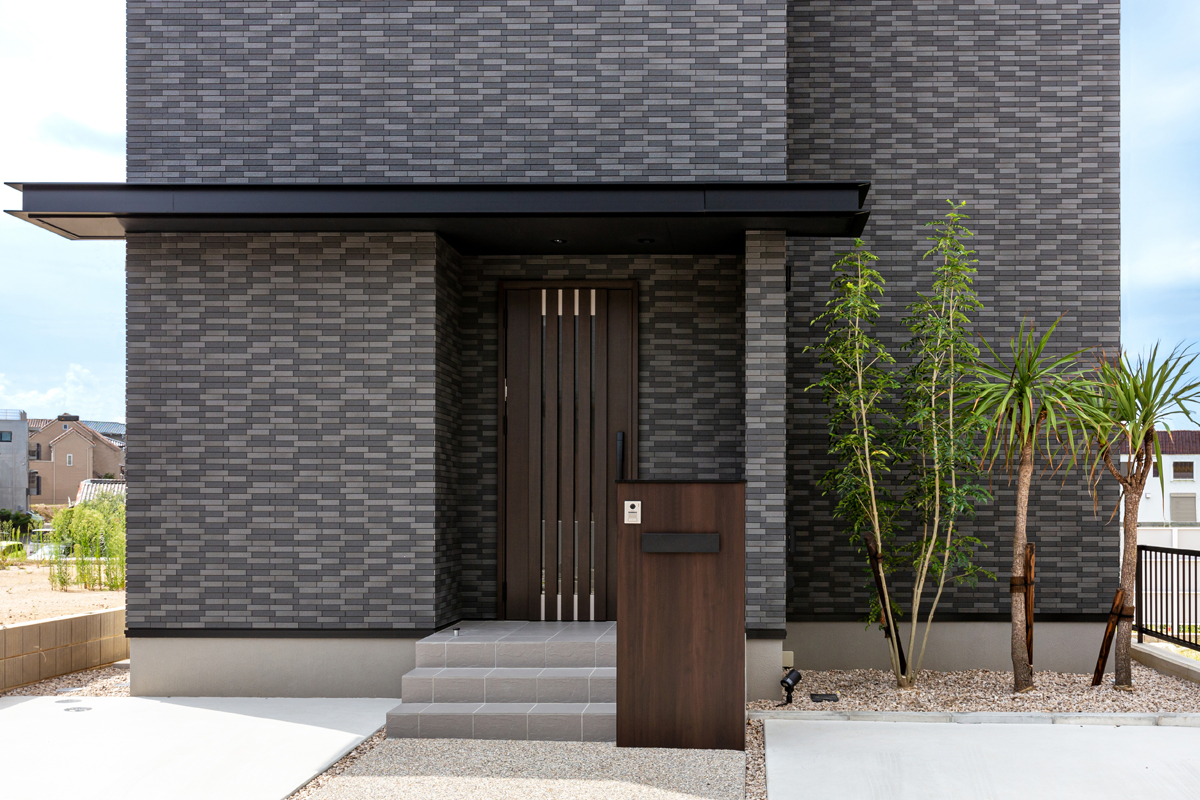 ファサード面に窓を取らず壁面を大きく見せた外観は、BOXをバランスよく配置したようなシルエット。フラット屋根やモノトーンの色味もあいまって、モダンでスタイリッシュな印象です。玄関上に施した幅広い庇は、外観デザインに水平ラインを加えることでシャープに見せるとともに、雨を遮り実用的にも活躍します。外壁は質感高いタイル材を全面に張り、シンプルでありながら重厚感のある外観です。