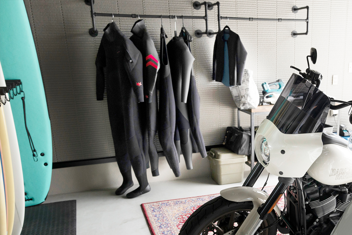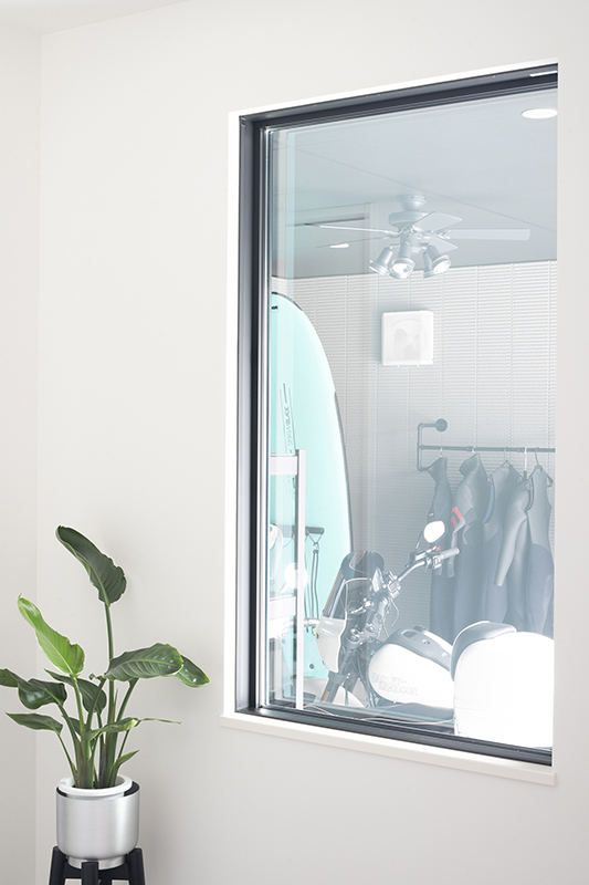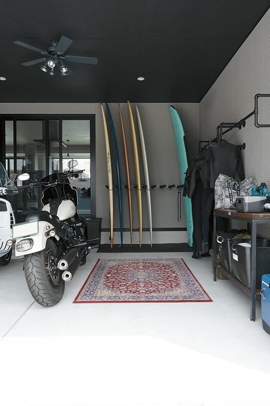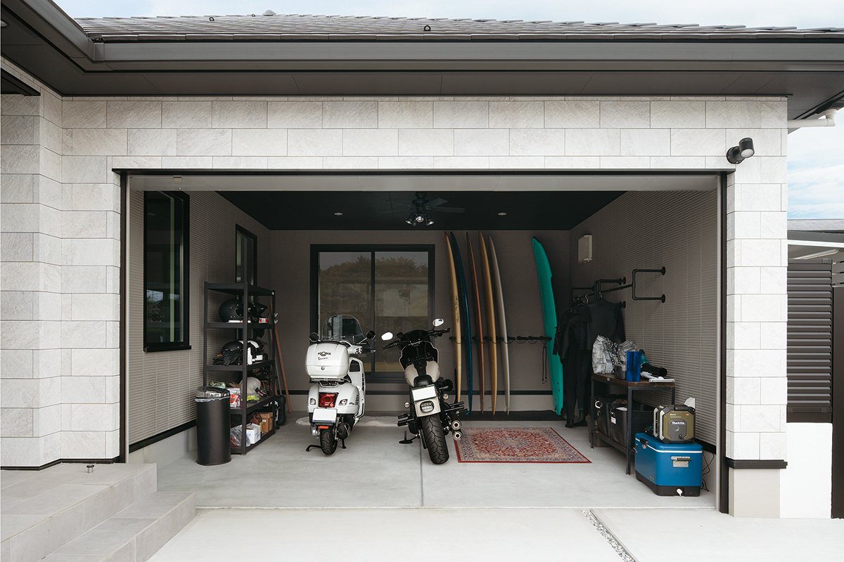バイクやサーフィンなど、数々の趣味を一緒に楽しまれているK様ご夫婦。玄関ポーチのすぐ横にあるインナーガレージは、お二人の趣味スペースとして作られました。ここはLDKなど室内3か所から眺められ、キッチン横の掃き出し窓からは出入りもできます。全館空調「スマート・エアーズ」がある事で室内の空気がガレージまで流れ込み、季節を問わず快適だそうです。サーフボード用のボードラックをご主人が手作りされるなど、好きなものに囲まれた空間をめいっぱい活用されています。