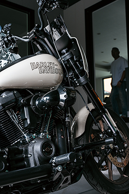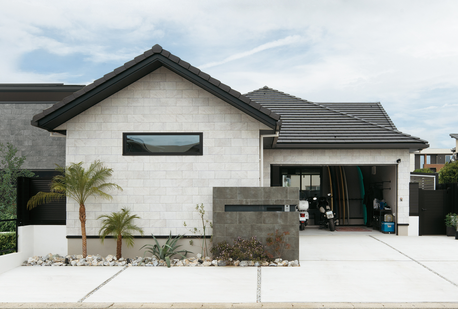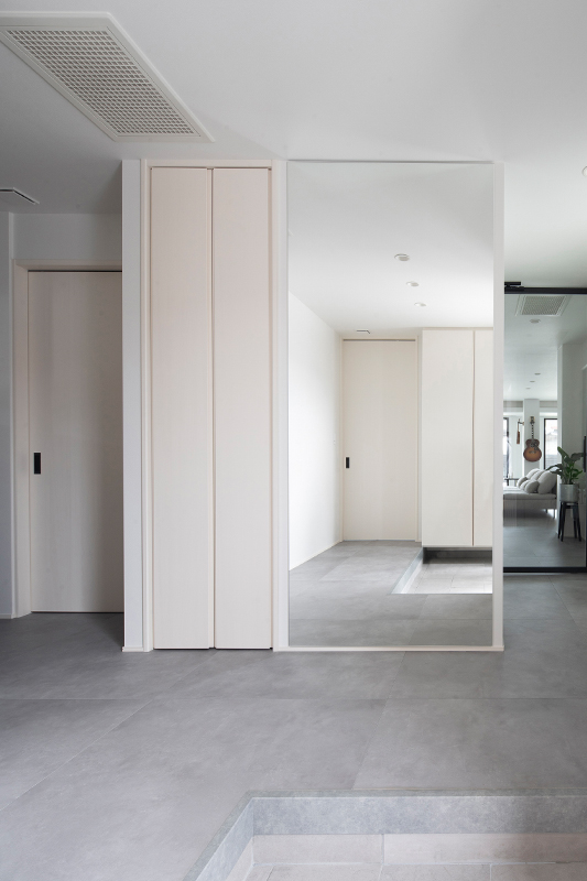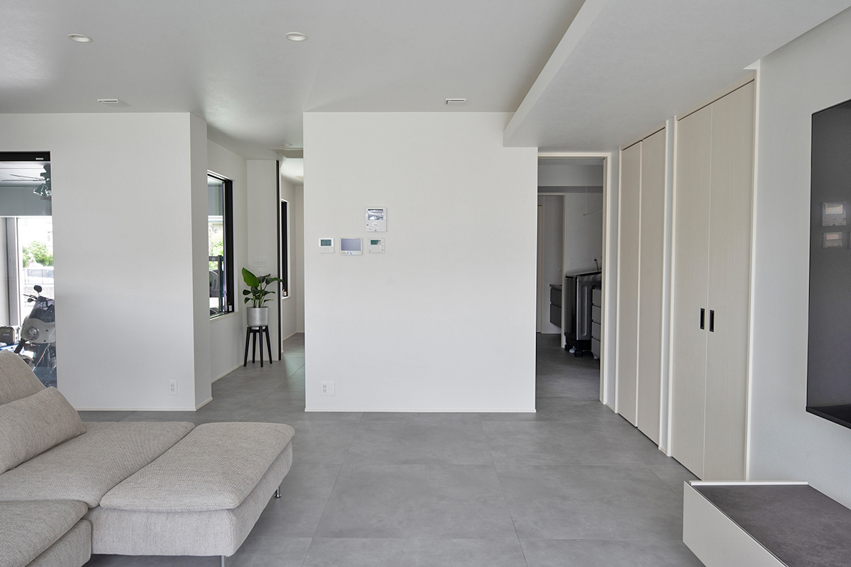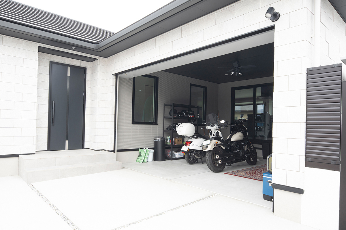 バイクやサーフィンなど、数々の趣味を一緒に楽しまれているK様ご夫婦。玄関ポーチのすぐ横にあるインナーガレージは、お二人の趣味スペースとして作られました。ここはLDKなど室内3か所から眺められ、キッチン横の掃き出し窓からは出入りもできます。全館空調「スマート・エアーズ」がある事で室内の空気がガレージまで流れ込み、季節を問わず快適だそうです。サーフボード用のボードラックをご主人が手作りされるなど、好きなものに囲まれた空間をめいっぱい活用されています。