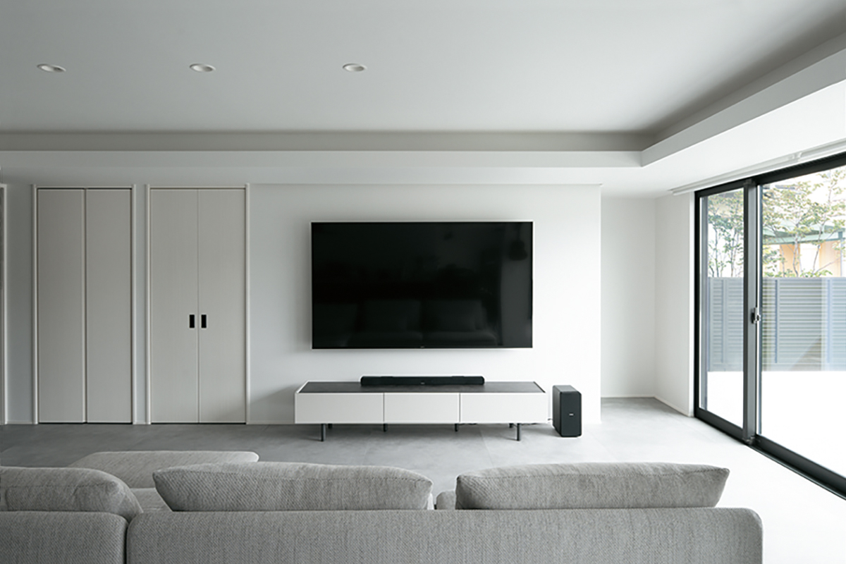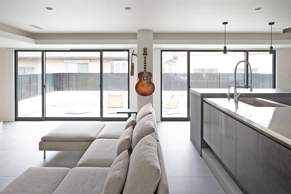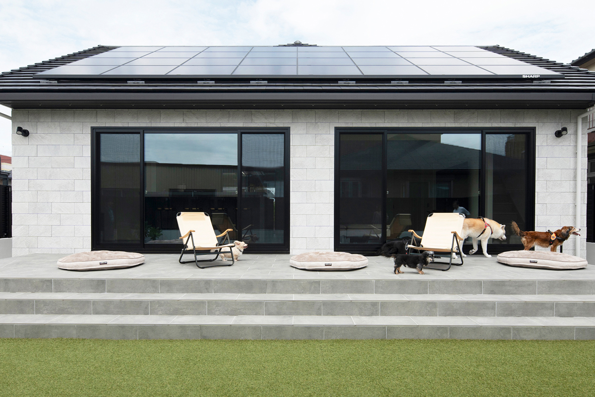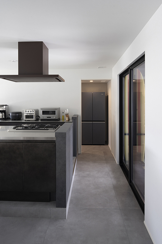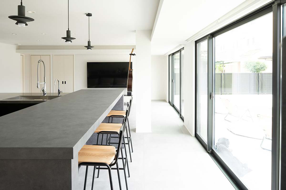 タイルの床材とグレーカラーのキッチンが調和し、落ち着いたモダンインテリアのLDK。30畳ほどの床面積がありながら、連続する大開口によってテラスや庭まで視界が広がり、より一層の開放感です。また、犬7匹と暮らすK様邸では、清掃性も欠かせないポイント。ほとんどの床材を目地の少ない大判タイルにすることで、抜け毛やトイレまわりを掃除しやすくしました。さらに、テラスと室内の床タイルは色を揃え、内外の一体感を演出。愛犬たちは内と外を自由に出入りし、思い思いの場所で寛いでいるそうです。