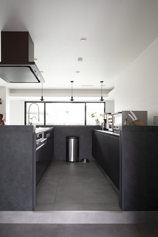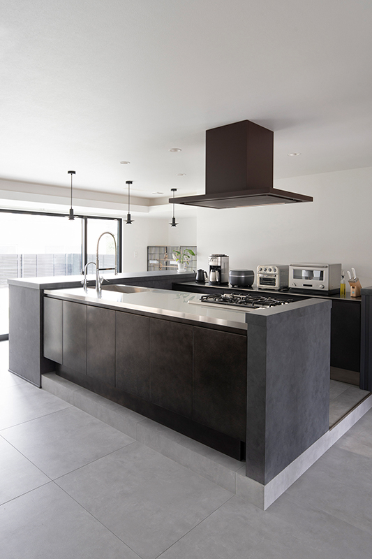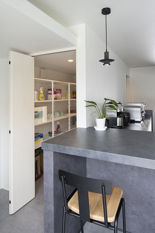 スタイリッシュなアイランドキッチンは、料理を担当するご主人がデザインにこだわり選ばれたもの。そこにカウンターテーブルと背面収納がコの字型に連続します。裏に大きなパントリーがあることで表はすっきりと美しく見え、床高を一段上げたことでまるでレストランのオープンキッチンのよう。庭やリビングを見渡しながら開放感いっぱいに料理ができます。また、お気に入りのキッチンデザインに違和感なく溶け込む「ワンちゃんゲート」を作りました。愛犬たちの立ち入りを防ぎ安全を守れます。さらにカウンターテーブルは1mほど高さがあるので、愛犬たちの手が届かず安心です。