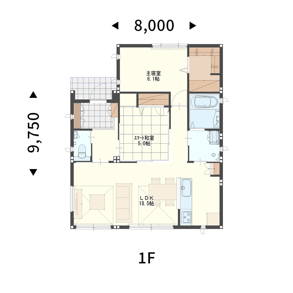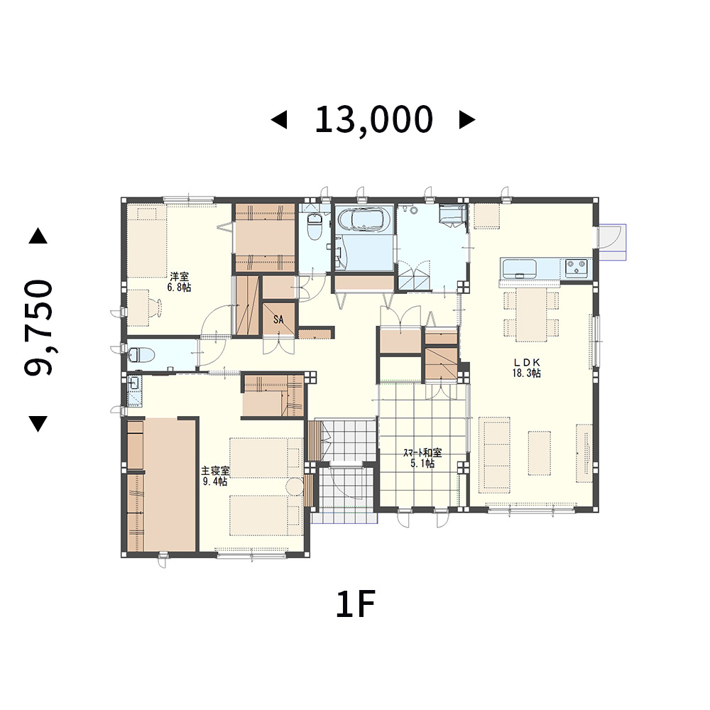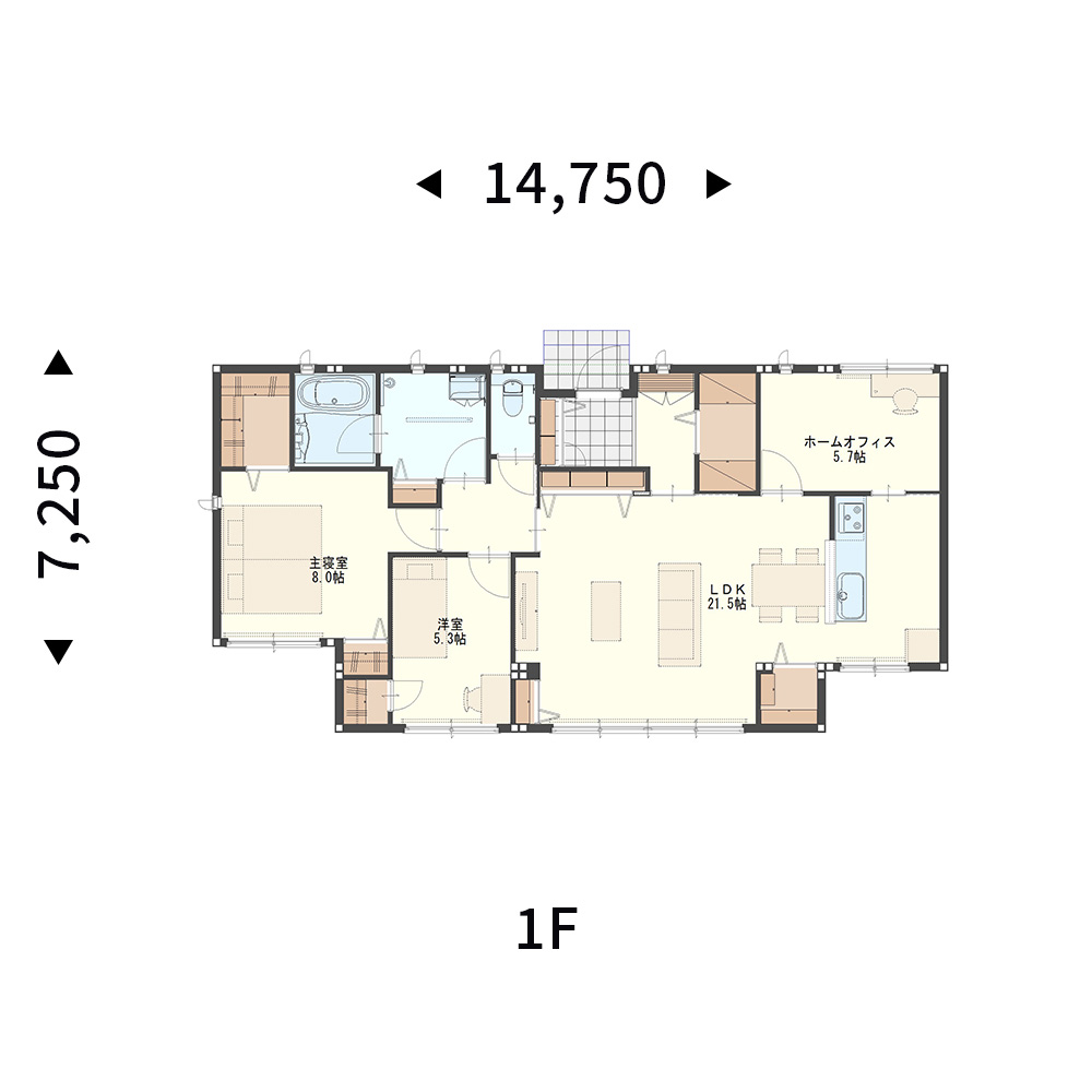 鉄骨ユニット同士の間を離すことで、敷地に合わせて最大限の空間を確保する、トヨタホーム独自の技術です。大空間のLDK、ワークスペースの追加や、収納スペースの確保など、間取りの自由度を高められます。