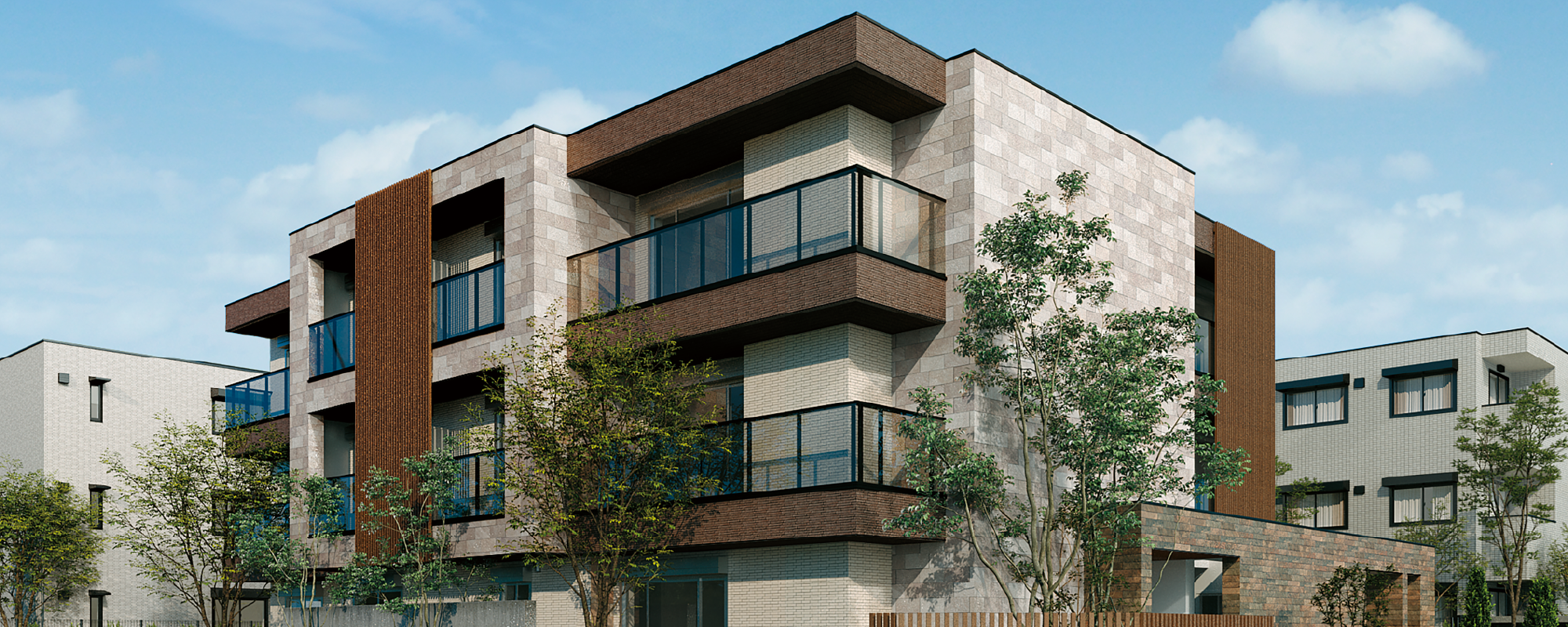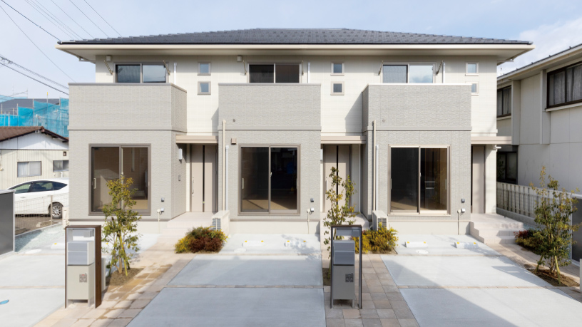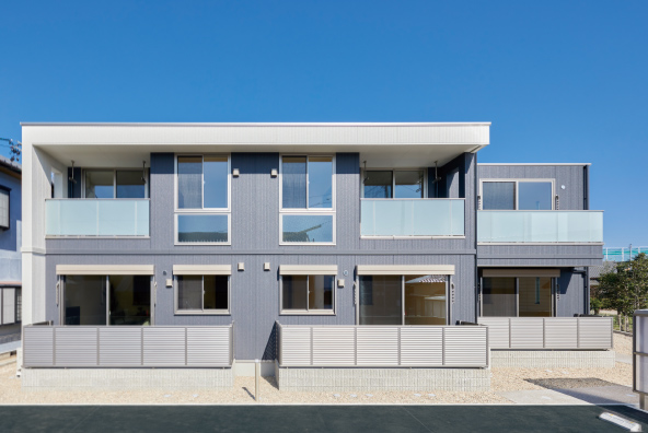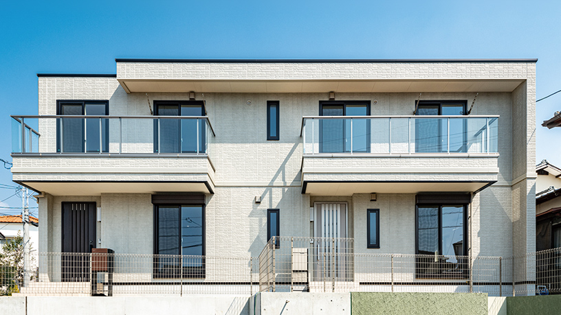 白い外観と透明パネルが爽やかさを演出 戸建感覚で暮らせるファミリー向け賃貸を実現