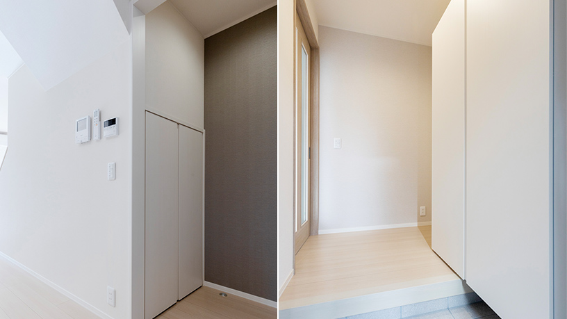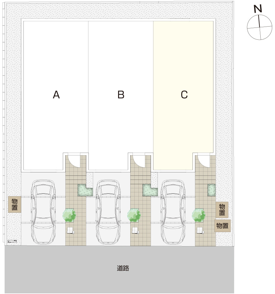 外観はアクセント窓や3連の凹凸により、表情豊かなファサードを演出。各戸に専用のアプローチ、宅配BOX付き門柱を設けることで、1棟でありながら3戸の独立性を保ち、戸建感覚で暮らせるようにしています。