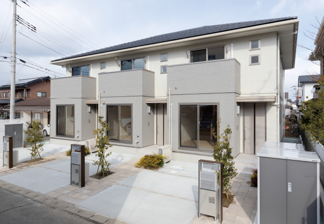 区画整理地の街並みに調和する、戸建風の佇まいが魅力の2階建の賃貸です。クローズ外構で安心感のあるセキュリティを実現し、各世帯のプライバシーにも配慮。新婚世帯をターゲットに2LDK全2戸を確保しました。