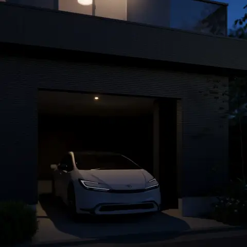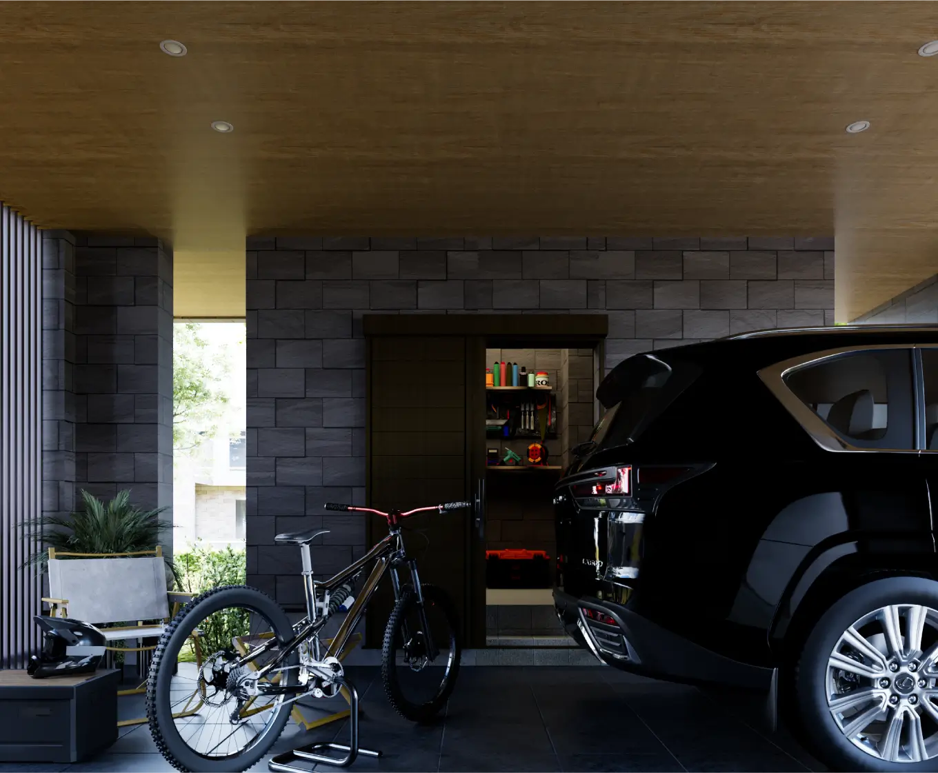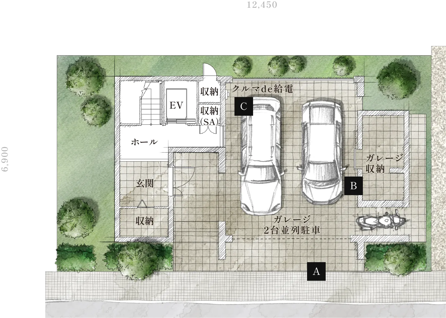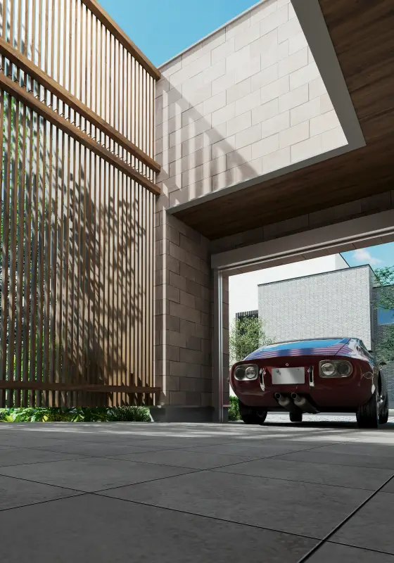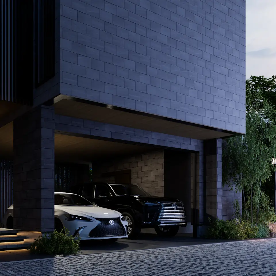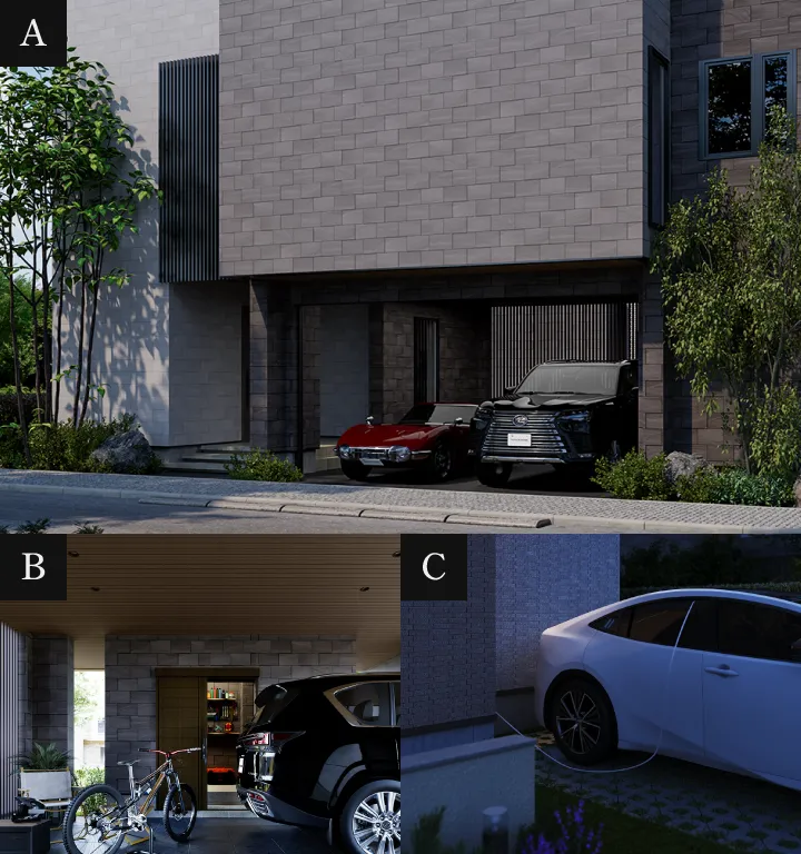 ゆとりの2台並列駐車スペースには、大容量のガレージ収納を備え、愛車のメンテナンス用品からアウトドア用品まで収まります。突然の停電時には、クルマを電源として電気を家に供給できる安心設備も。雨の日、両手に荷物を抱えていても、濡れずに玄関へ歩いてゆける心地よさ。