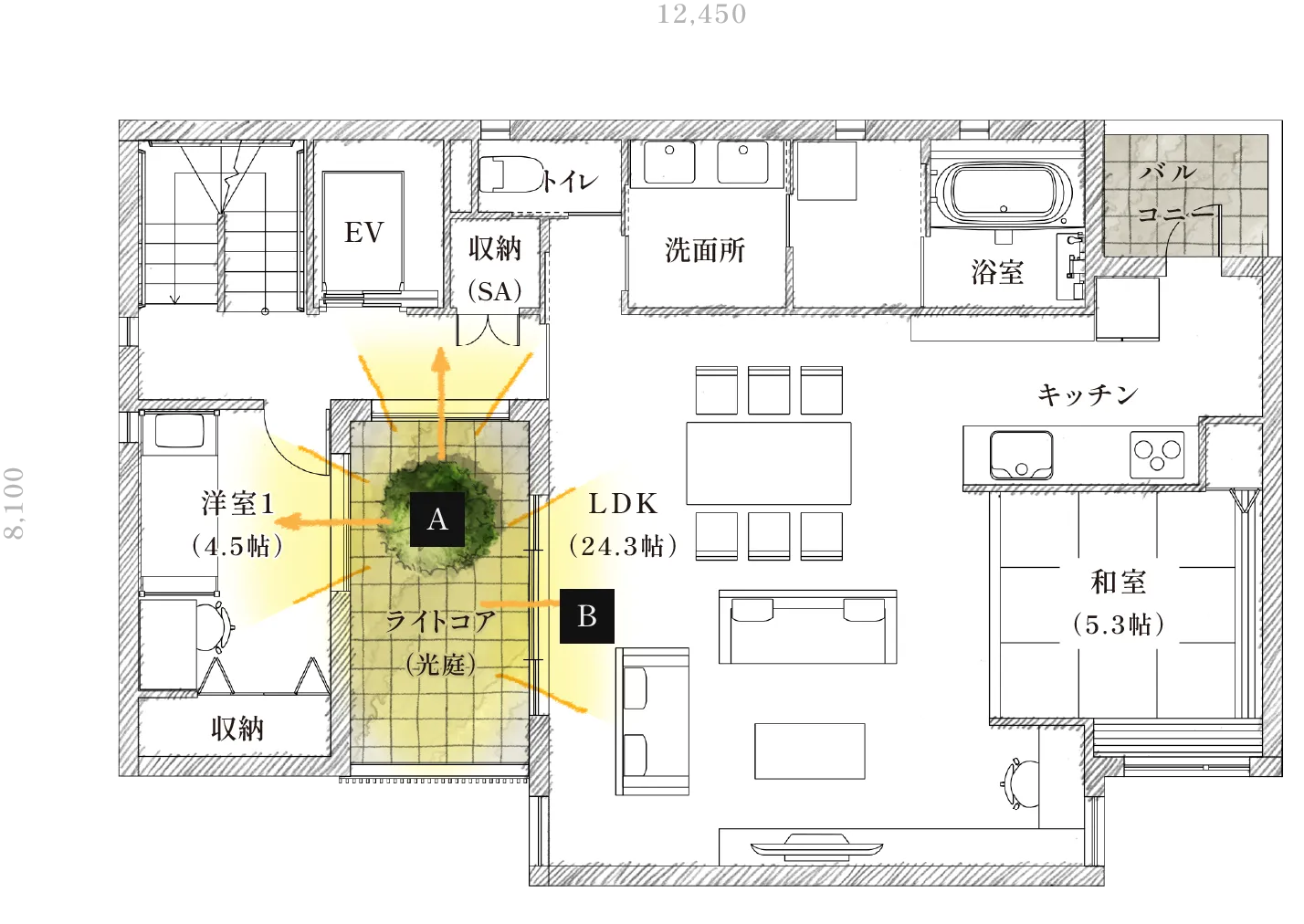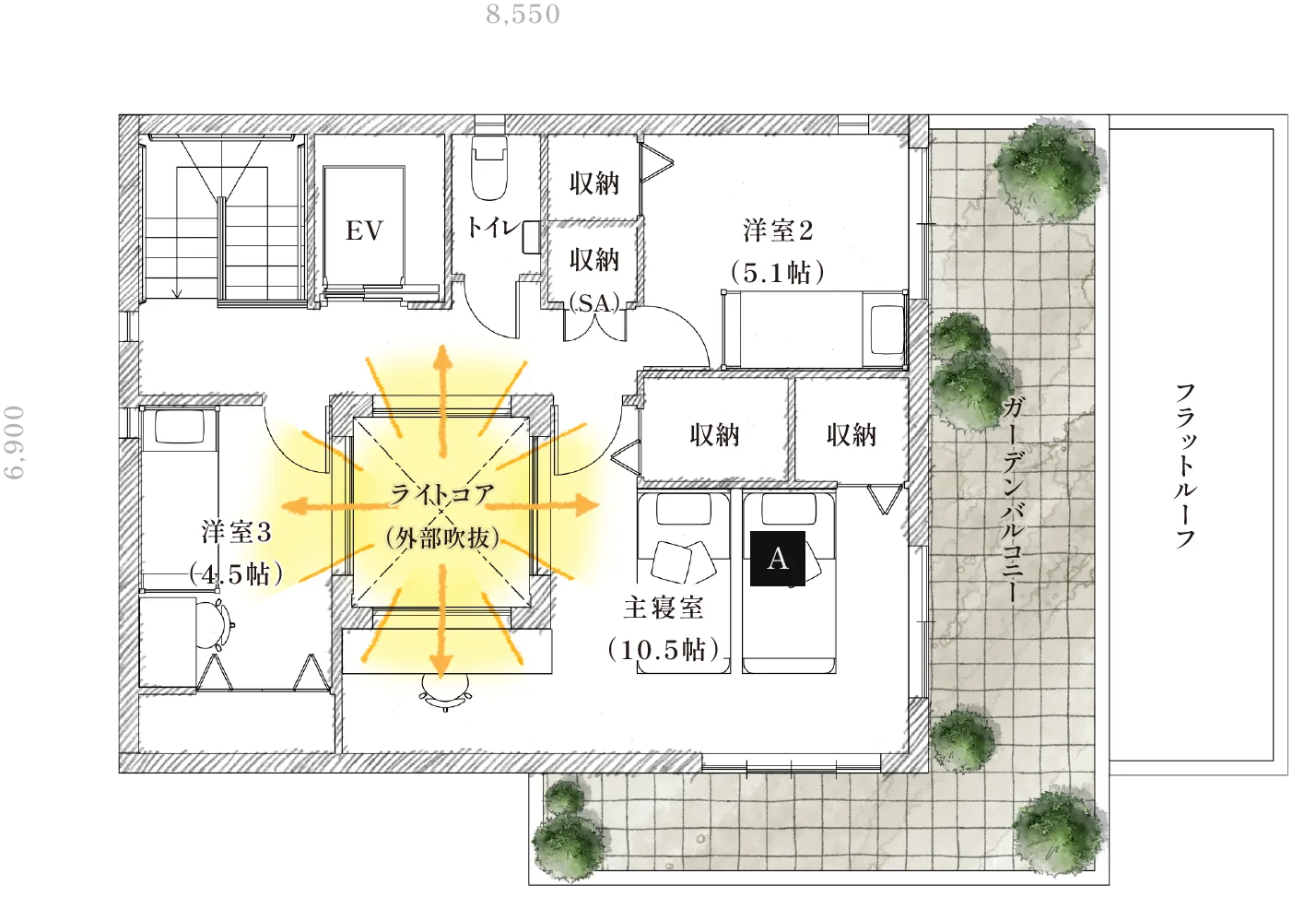 明るく開放的な複層空間が広がります。2・3階のライトコアにより、