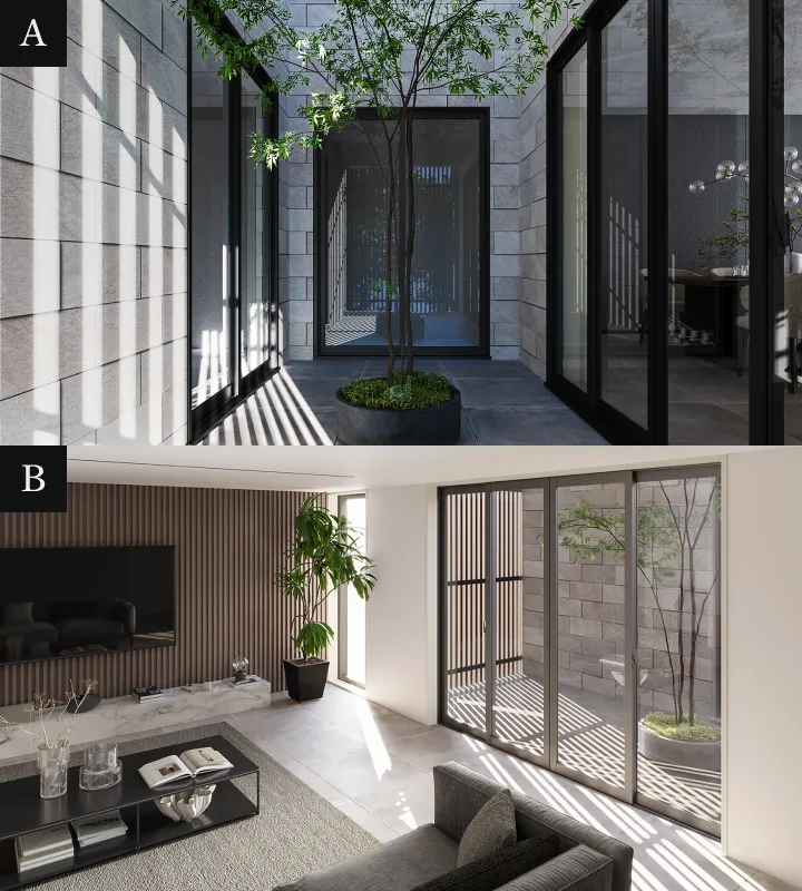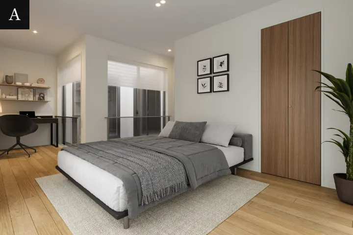 主寝室は街の喧騒から離れた3階に配し、都市での穏やかな眠りを確保。休日の朝は、ライトコアからの柔らかな光の気配で目覚める。